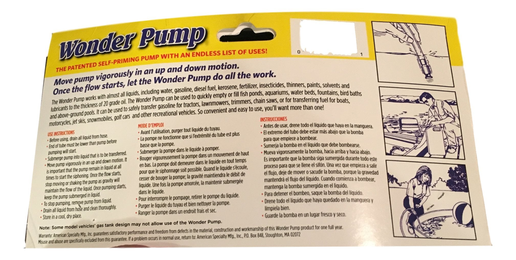 Safely, simply, and quickly transfer liquids, up to 3-1/2 GPM (gallons perminute), to and or from ponds, aquariums, above ground pools, fountains, lawnmowers, motorcycles, etc. All you have to do is shake the pump to activatepump. The following liquids can travel through the Wonder Pump: water,gasoline, diesel fuel, kerosene, fertilizer, insecticides, thinners, paintsolvents and lubricants up to the thickness of 20 grade oil.