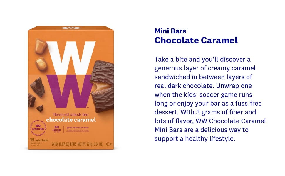 With 3 grams of fiber per serving and lots of flavor, WW Chocolate Caramel Mini Bars are a delicious points-friendly way to treat yourself—without any artificial flavors, colors, or sweeteners. Unwrap one when the kids’ soccer game runs long, or enjoy your bar as a fuss-free dessert to discover for yourself why these bars are one of our best-selling snacks.