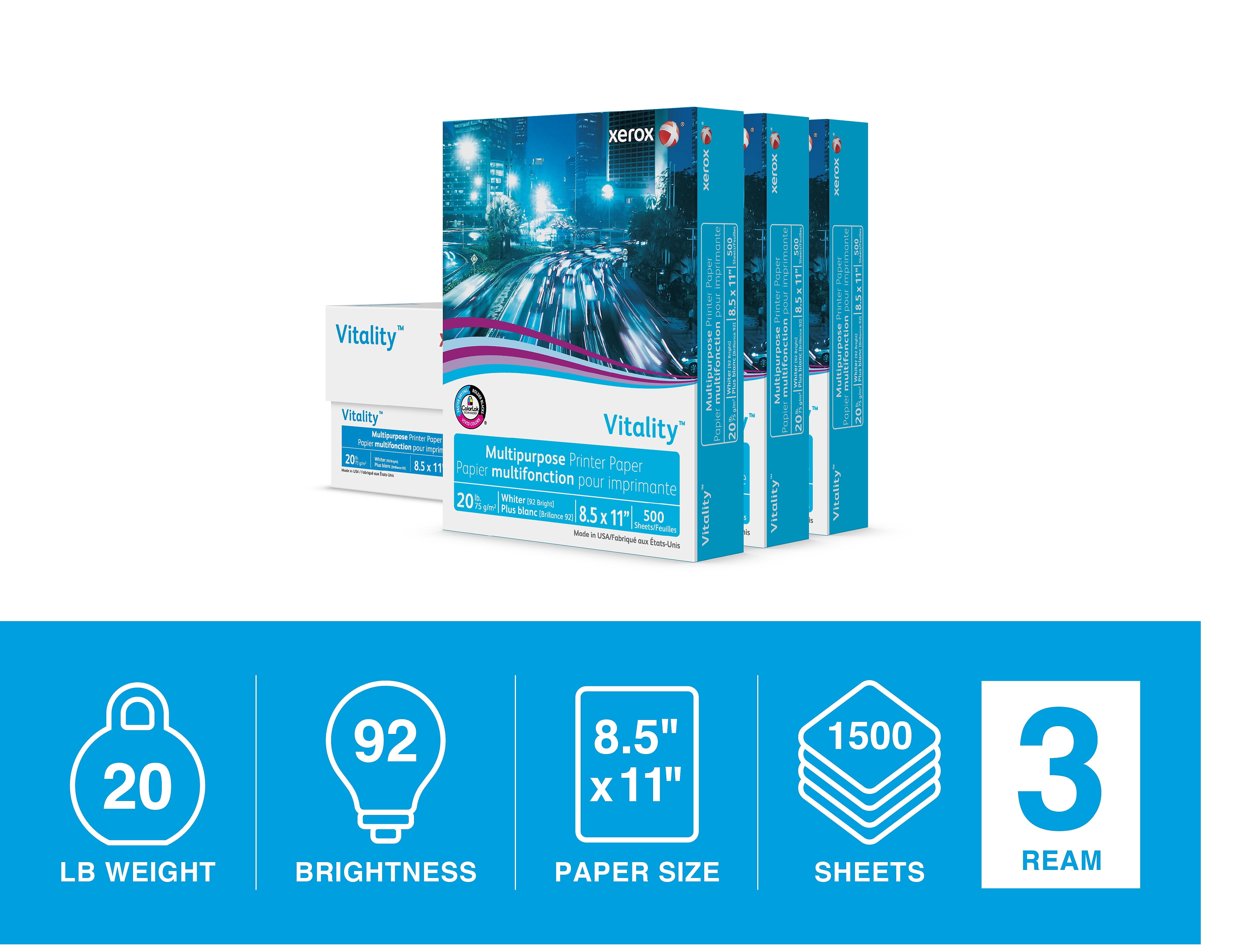 Vitality Multipurpose Print Paper 92 Bright, 20 lb, 8.5 x 11, White, 500 Sheets/Ream, 3 Reams/Carton
