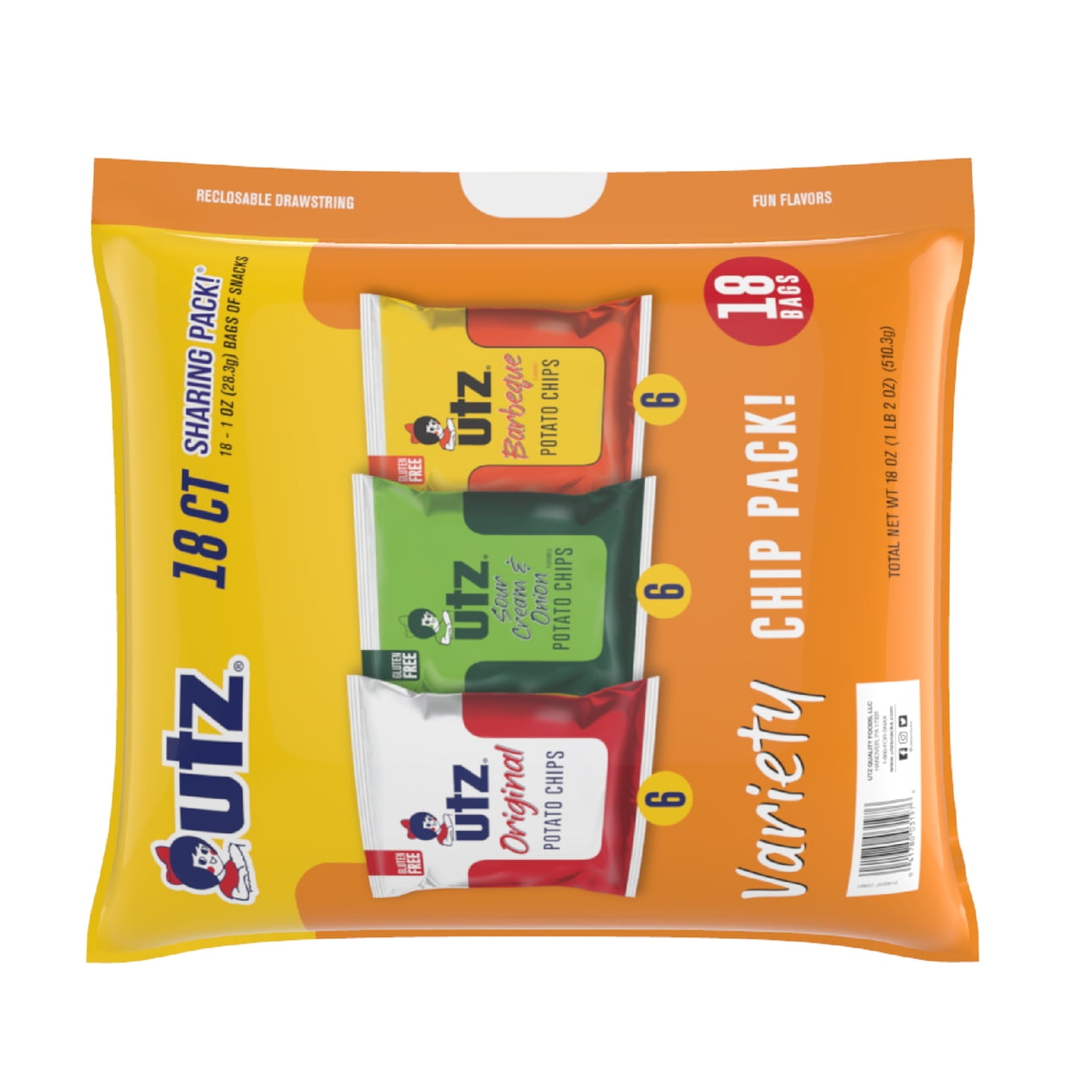 Utz® 18 count Variety Chip Pack is individually packaged, perfect for packing lunches, great for the Office, Meetings, Schools, Friends & Family. Enjoy 6 bags of Utz® Original Potato Chips, 6 bags of Utz® Sour Cream & Onion Potato Chips, and 6 Bags of Utz® Barbeque Potato Chips. Utz snacks are an ideal snack on their own, and they also taste great paired with your favorite sandwich. This pack is full of single serve individual bags are perfect for lunches, cook outs, party favors, and on-the-go salty snacks, or keeping handy for whenever the cravings strike. Also great for traveling, sporting events and picnics! This Utz® variety snack pack not only holds 18 individual 1 oz bags of your favorite Utz® snacks but is also a drawstring resealable sack or keeping things tidy in your cabinets. Choose Utz® for quality snack foods made with quality ingredients that are crunchier, fresher, and simply better.