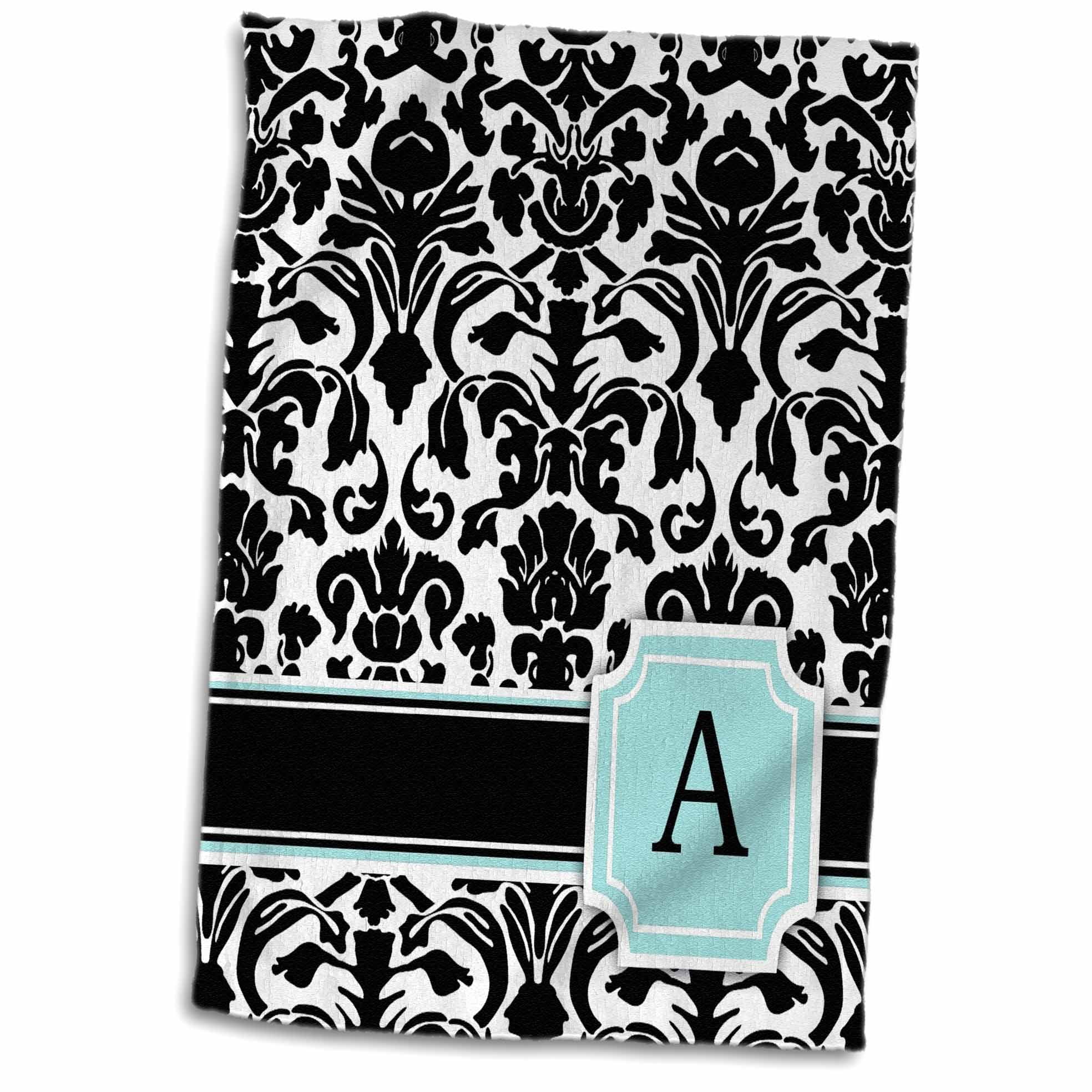 Letter A personal monogrammed mint blue black and white damask pattern – classy personalized initial Towel is great to use in the kitchen, bathroom or gym. This 15 by 22 inch, hand/sports towel allows you to customize your room with a special design or color. Great for drying dishes, hands and faces. Suitable to put in any sports bag. Image will not fade after washing. Machine wash, tumble dry low, do not bleach. Towel will regain its fullness after the first washing. Made of 63% polyester (microfiber) /37% cotton (velour terry cloth). Image printed on microfiber side/ terry cloth side blank.