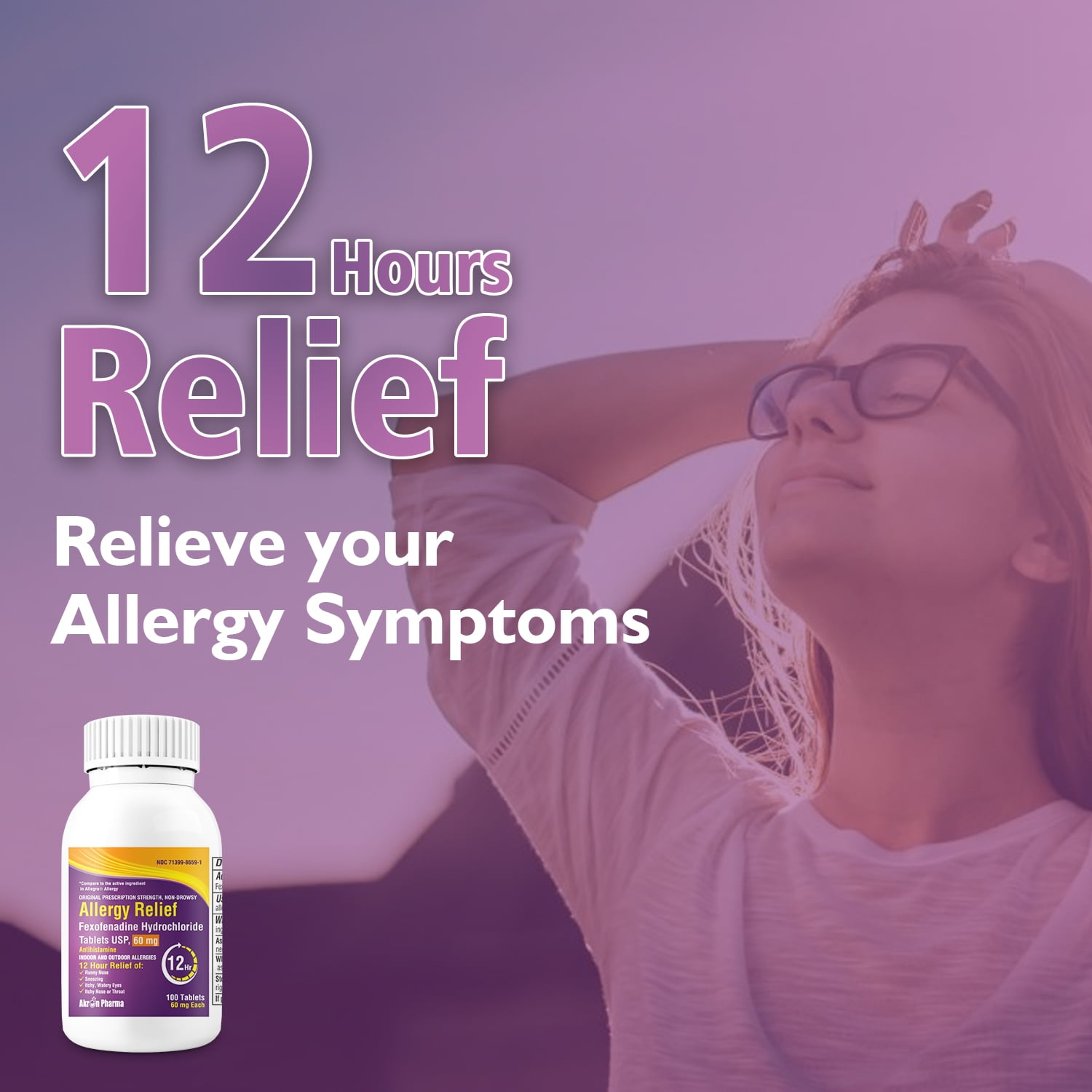 ACTIVE INGREDIENT: The active ingredient in this Allergy is Fexofenadine Hydrochloride 60 mg, an antihistamine approved for the treatment of both indoor and outdoor allergy symptoms. Compare to Allegra Allergy active ingredient. ALL DAY ALLERGY RELIEF: One dose of Fexofenadine Allergy works up to 12 hours to relieve allergy symptoms. READ THE LABEL: Approved to temporarily relieve indoor and outdoor allergy symptoms in adults and children 12 years of age and older. ALLERGY MEDICINE: Temporarily relieves symptoms due to hay fever or other upper respiratory allergies: runny nose; itchy, watery eyes; sneezing; itching of the nose or throat. NON-DROWSY ANTIHISTAMINE: This medicine is non-drowsy, allowing you to go about your day with all day allergy relief.Akron’s Fexofenadine Allergy Relief HCl ,60 mg, 100 count
