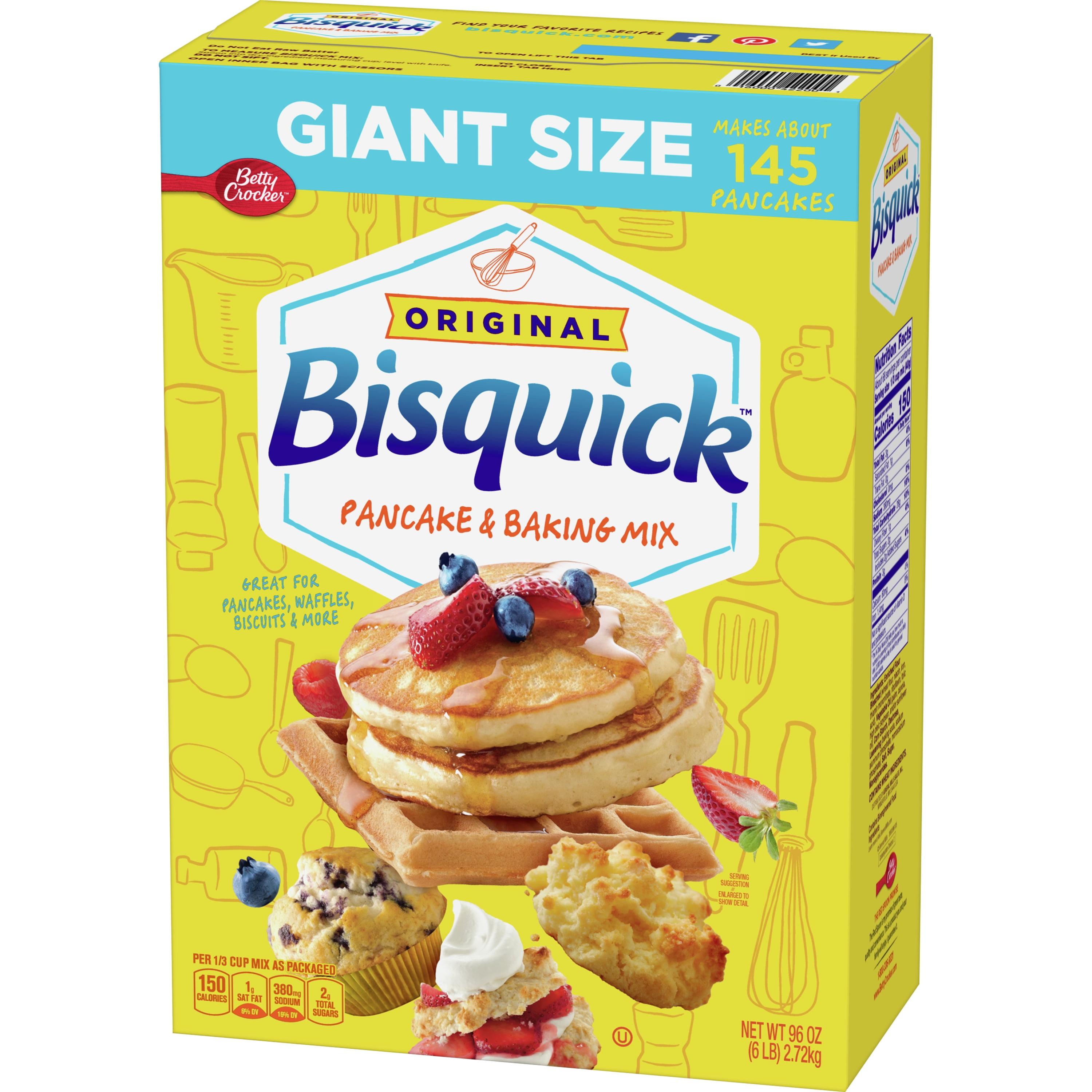 Fluffy pancakes, mouthwatering waffles and more — all easy as pie, and you can even make that too. Bring all your favorite recipes and cravings to life with the ease and convenience of a 96-ounce box of Bisquick Original Pancake & Baking Mix. Simply add milk and eggs, pour onto a greased griddle and be ready to stack up the most delicious pancakes ever. Then make them your own with a buffet of tasty toppings — from classic maple syrup to peanut butter and bacon. Whether you’re making delicious pancakes for breakfast or flaky biscuits for dinner, you’ll be amazed at the versatility and thrilled with the scrumptious results every time.