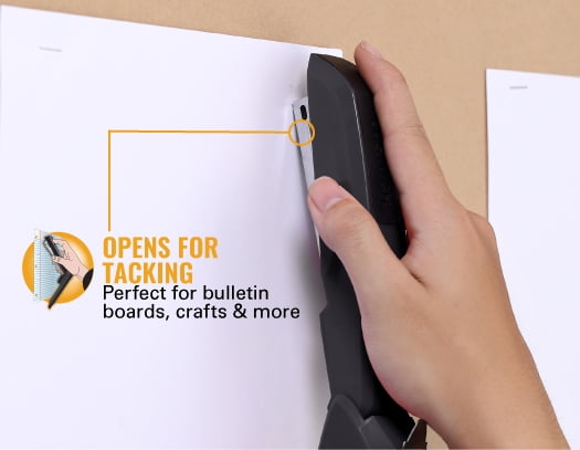 This ergonomically designed stapler features an extremely comfortable yet stylish shape. The soft rubber grip and base provide an optimum grip, for easy stapling and maximum control. The Staple Store compartment keeps extra staples close at hand, located at the bottom of the stapler. The built in stapler remover gives convenient staple removal. This stapler is protected and can staple up to 20 sheets. It can effortlessly be opened for bulletin tacking and craft applications. This product uses Bostitch standard staples SBS191/4CP.