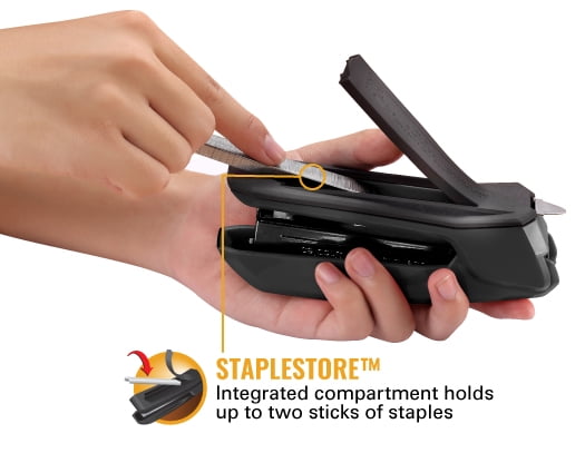 - Integrated Staples Store compartment keeps extra staples close