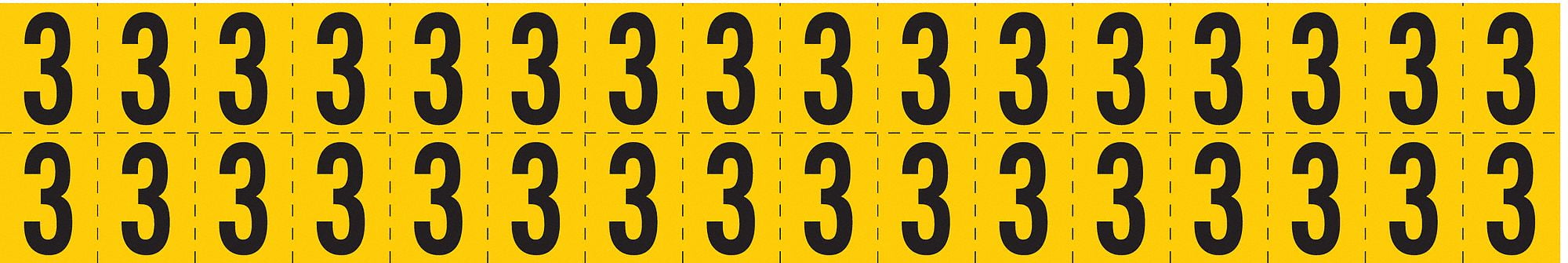 Carded Number, Character 3, Character Height 5/8 in, Overall Height 3/4 in, Overall Width 9/16 in, Character Type Numbers, Material Vinyl, Background Color Yellow, Retroreflective Grade Not Retroreflective, Glow-in-the-Dark No, Markers per Card 32, Number of Cards 1, Character Width 9/16 in, Standards ASTM B 117; ASTM D 1000; ASTM D 2979; ASTM G 155; UL Recognized, Character Color Black, Package Type Sheet, Die Cut Yes
