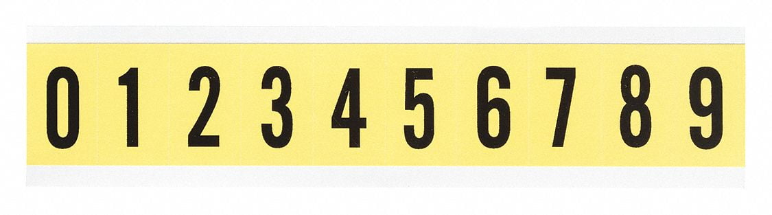 Carded Number Kit, Character 0 Thru 9, Character Height 1 in, Overall Height 1 1/2 in, Overall Width 7/8 in, Character Type Numbers, Material Vinyl, Background Color Yellow, Retroreflective Grade Not Retroreflective, Glow-in-the-Dark No, Number of Cards 1, Standards ASTM B 117; ASTM D 1000; ASTM D 2979; ASTM G 155; UL Recognized, Character Color Black, Includes 10 Numbers Per Card, Package Type Sheet, Die Cut Yes