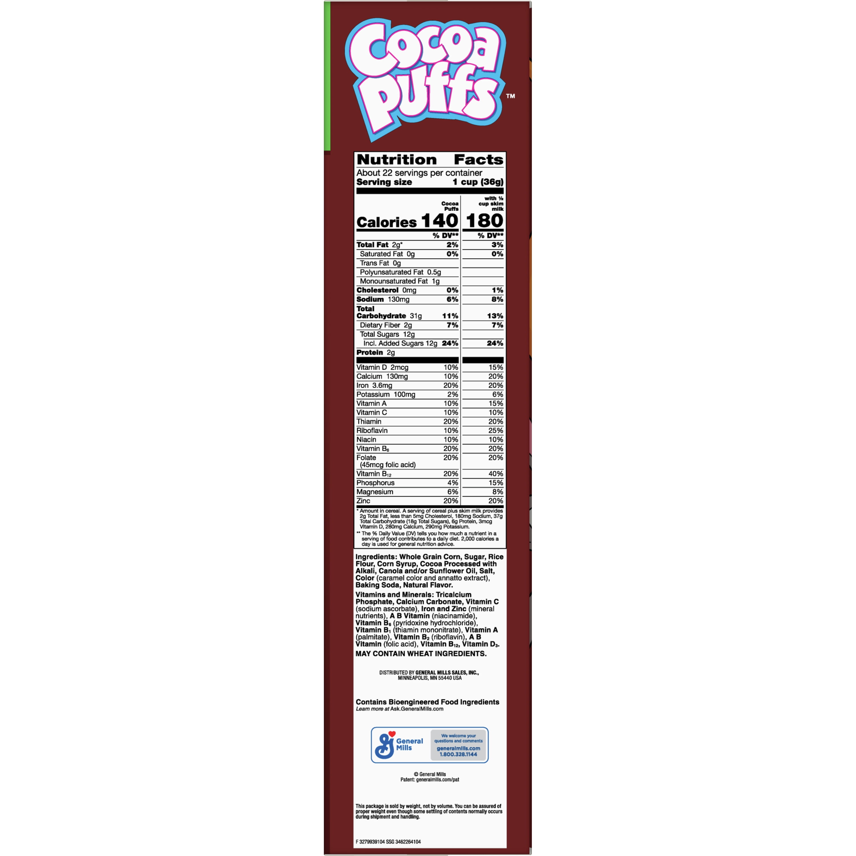 Your family will go cuckoo for the delicious chocolatey taste of Cocoa Puffs Cereal! Cocoa Puffs are naturally flavored frosted corn puffs bursting with the chocolatey taste kids love.Cocoa Puffs are made with whole grains (14g whole grain per serving; at least 48g recommended daily) and without high fructose corn syrup.. Every serving of Cocoa Puffs has vitamins and minerals..When Cocoa Puffs splashes down into your bowl, it turns the milk into an extra slurp-a-licious and chocolatey treat! The rich taste of this chocolatey cereal is the perfect partner to start off your kids’ morning with fun and flavor. Pack it for a school (or after school) snack or bring a bag along next time you’re on the go.Have your kids enjoy it by the bowlful or the handful for a delicious addition to a meal or snack that you can feel good about sharing.