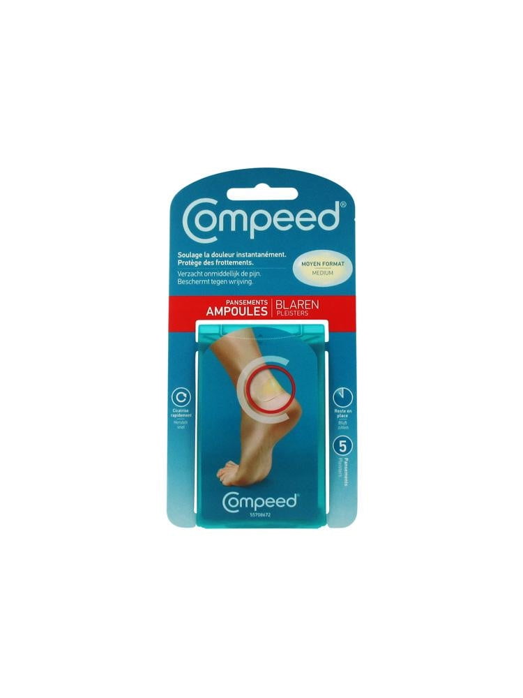 When your shoes rub against your skin, the first layers of the skin are damaged and a bulb can be formed. Compeed Blisters Medium Size 5 Plasters acts then like a second skin for:- To protect from frictions and to relieve the pain.- To isolate from water, the bacteria and the impurities to prevent the infections.- To adhere perfectly during several days for a fast cicatrization.Anatomical form oval, autoadhesif, absorbent, end, hypoallergenic, permeable with the steam, impermeable with water, With Compeed, the bulbs cannot any more stop youCompeed Blisters Medium Size 5 Plasters