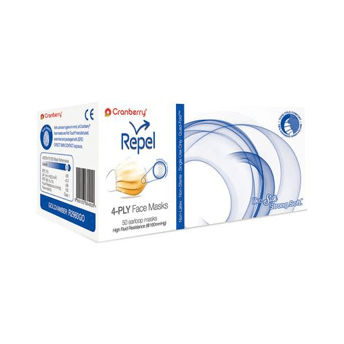Earloop Mask SILVER 50/Box. 4-Ply Quad-fold High Fluid Resistance with the innovative HydroGuard layer. Exceed ASTMF 1862 standards for synthetic blood penetration at 160mmHg. 100% latex- and fiberglass-free, inner layer with CoolSilk and lint-free. PFE >99% at 1.0 micron, BFE > 99%.Cranberry R2960SI Repel 4-Ply ASTM Level 3 Earloop Face Masks Pearl Silver 50/Box