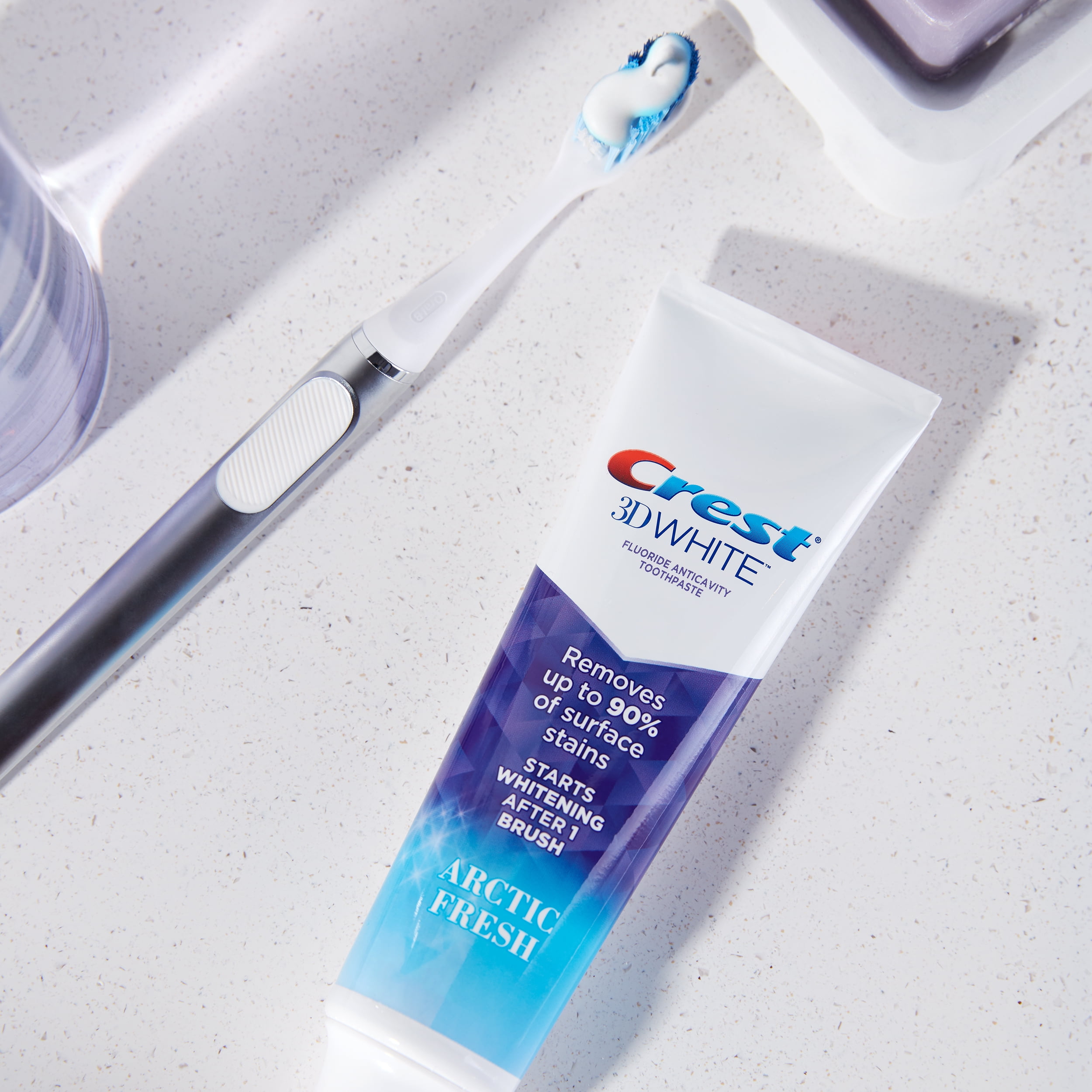 Brighten your smile with Crest 3D White Arctic Fresh Whitening Toothpaste. The New and Improved Formula removes up to 90% of surface stains, protects against future stains & starts whitening your teeth after 1 brush. 3D White fluoride toothpaste also strengthens your tooth enamel and helps protect against cavities.