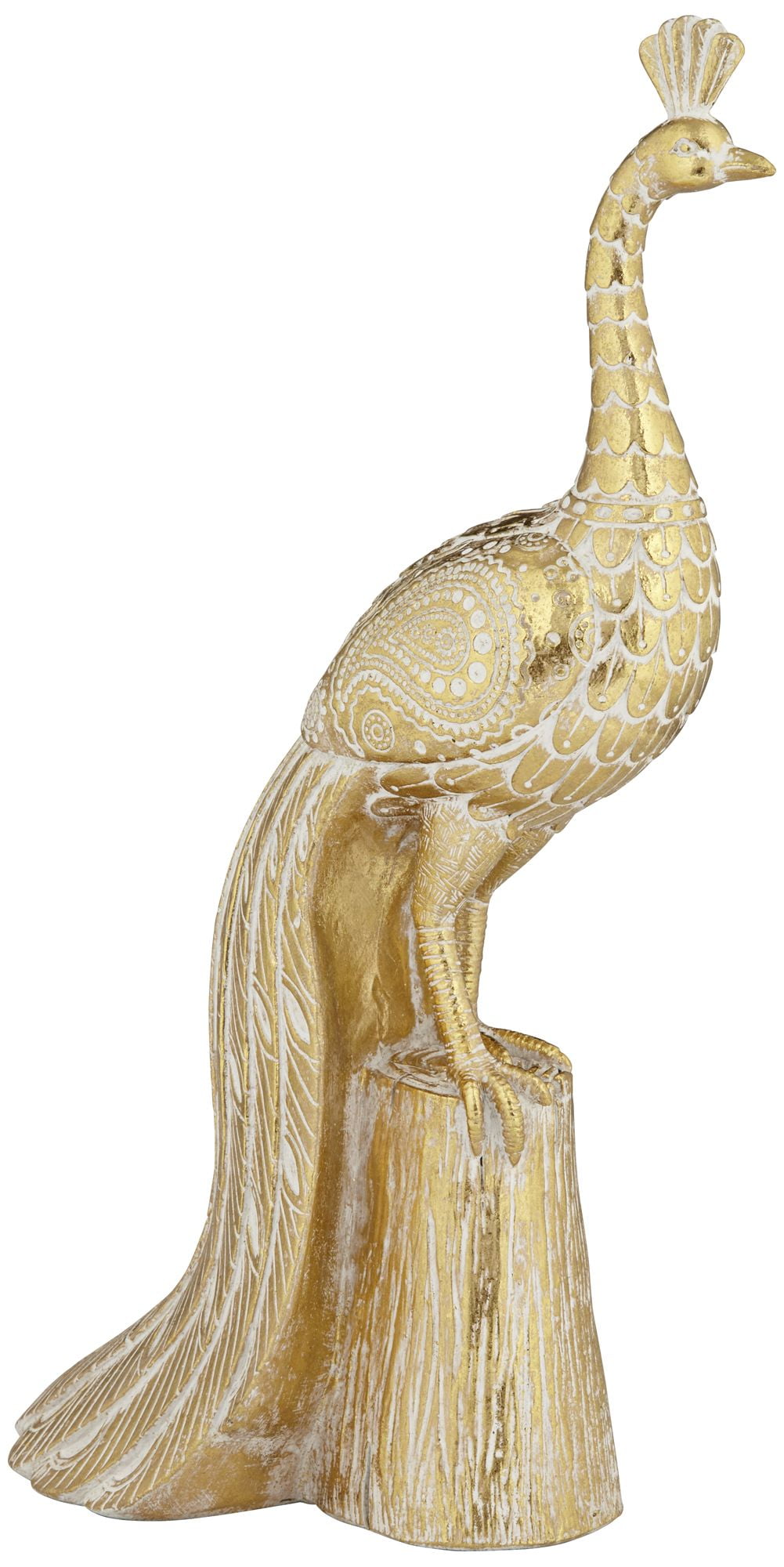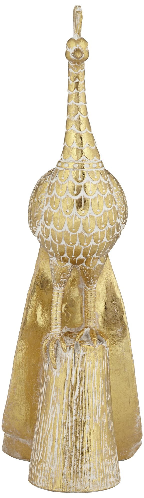 A regal peacock becomes front and center in an indulgent display of decadence. This stunning statue offers a detail-rich peacock figurine coated in hand-painted gold and white finishes. Modern with a touch of traditional, it delivers the ultimate in elegance and becomes a focal point in any space. Embrace avian-inspired nature with gallery influence.