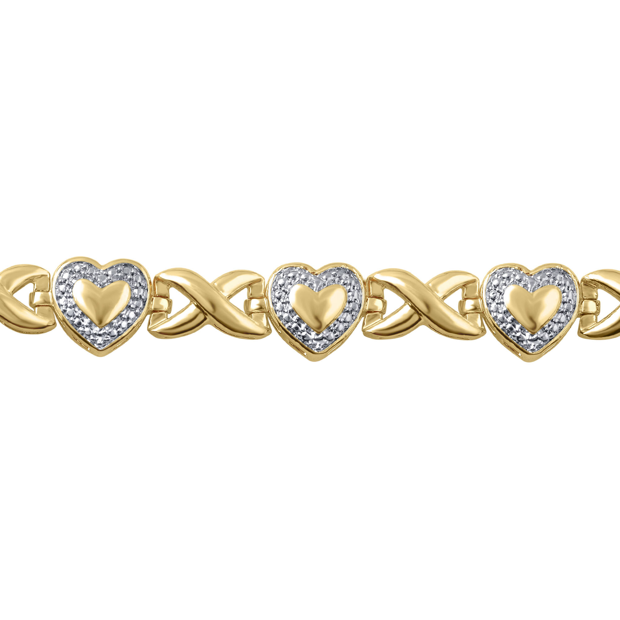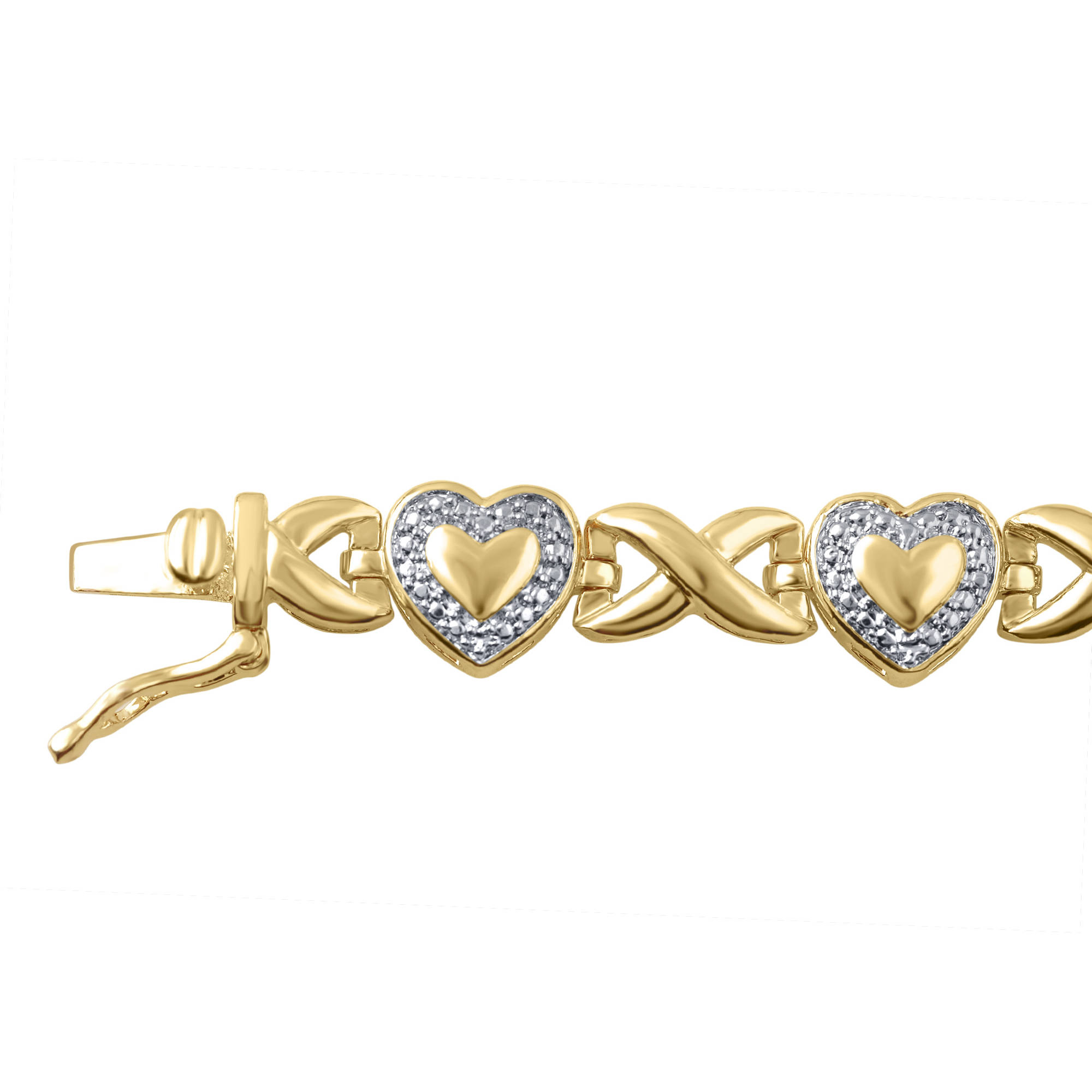 Featuring a gorgeous gold tone finish and diamond accents, this heart ornamented bracelet is the perfect gift for the special women in your life. Featuring plain hearts, this bracelet is a beautiful complement to any ensemble and is sure to make any recipient radiant and proud.Diamond Accent 14k Yellow Gold Over Bras