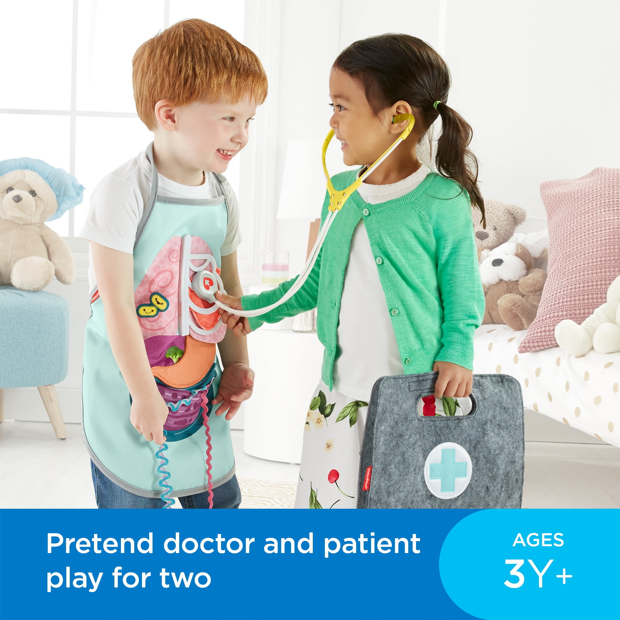 The Fisher-Price Patient and Doctor Set lets kids go from patient to doctor and back again for endless pretend play appointments! The fabricdoctor bagis equipped with all the cool tools of the trade, like a pretend syringe, thermometer, and more,featuring smooth wood accents. And the colorful fabric patient apron lets preschoolers explore the insides of the body…and discover fun surprises along the way!