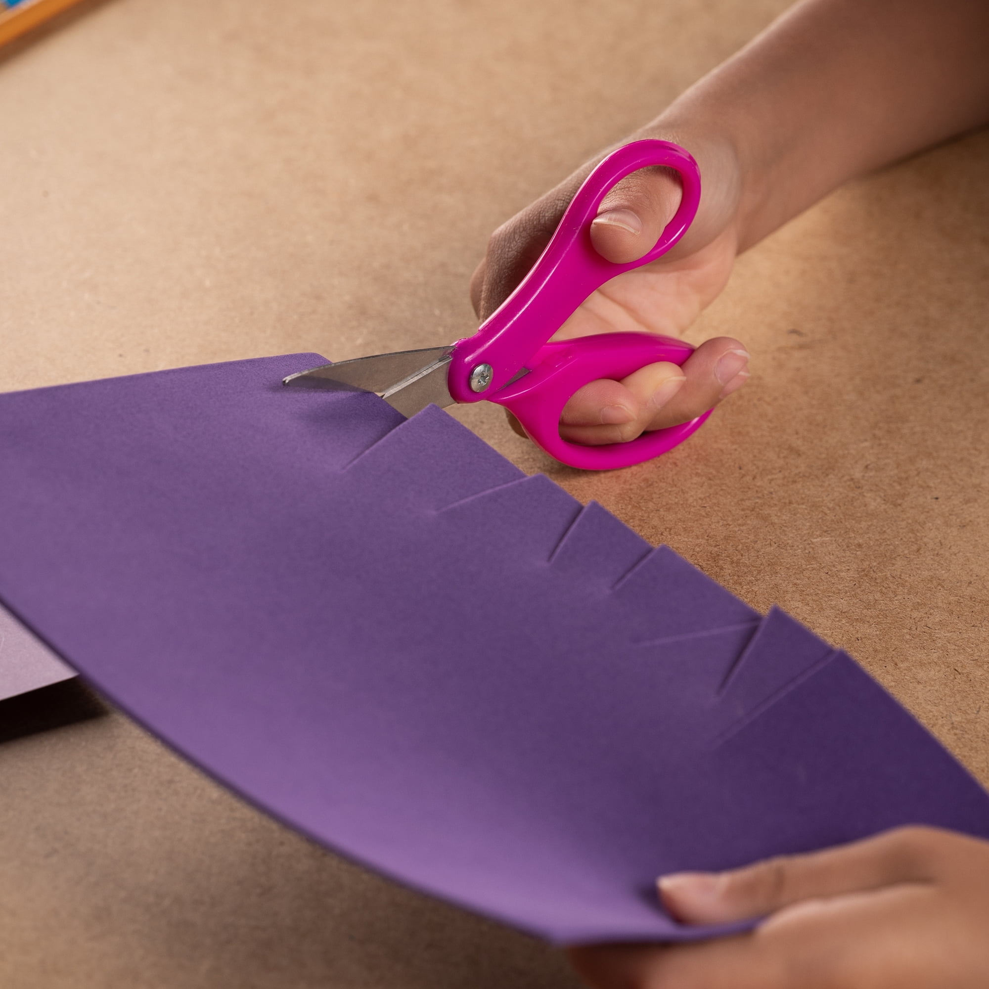 Fiskars 5" Pointed Kids Scissors are designed with safety-edge blades, a pointed tip for improved detail cutting, and handles engineered for children’s hands. A larger finger loop and an ergonomic thumb loop provide a natural, more comfortable fit for kids’ fingers. The blades open at an angle that helps kids open the blades without losing their grip for improved control. Additionally, the handle is built to be in-line with the blades to allow for better precision while cutting. Ideal for children ages four and up. Comes in multi-color handles.