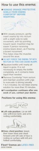 Fleet Enemas are latex free. Ready-to-use. Latex free. Soft, flexible Comfortip. Easy squeeze. Extra cleansing. Extra relief. No. 1 doctor recommended. 70% extra volume. 70% more volume than regular Fleet enema. Provides extra cleansing and extra relief. Clinically proven to be both safe and effective. Protective shield prevents contamination. Pre-lubricated Comfortip for ease of insertion. One-way safety valve controls flow and prevents reflux. Easy squeeze bottle. Each 197-ml delivered dose contains: sodium 4.4 g. This product generally produces a bowel movement in 1-5 minutes.
