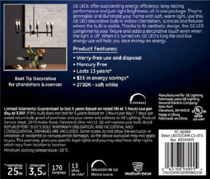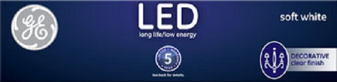 GE LED Soft White 25-Watt Replacement Clear Deco light bulb offers outstanding energy efficiency, long-lasting performance and just-right brightness, all in one package. It is dimmable and illuminates your home with warm, soft white light. Use this medium-base LED decorative bulb in indoor chandeliers, sconces and fixtures where the bulb is visible. Thanks to its aesthetic design, Soft White LED 25-Watt Replacement Clear Deco light bulb compliments your fixture and adds a decorative touch even when the light is off. When it is turned on, its long life and low energy use will help you save money on energy.
