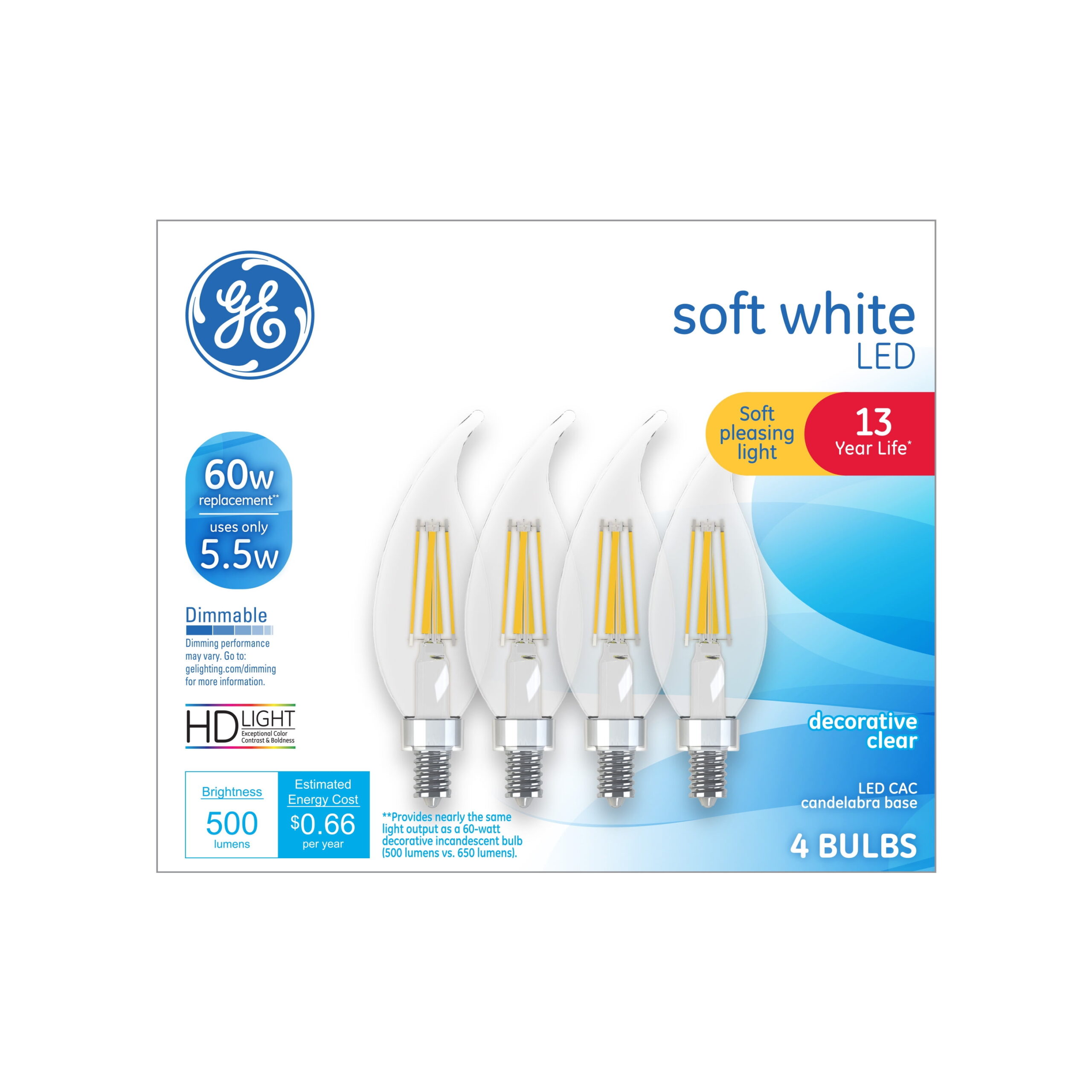 GE LED 5.5-Watt (60W Equivalent) HD Soft White Clear Decorative Bent Tip Light Bulbs, 4pk