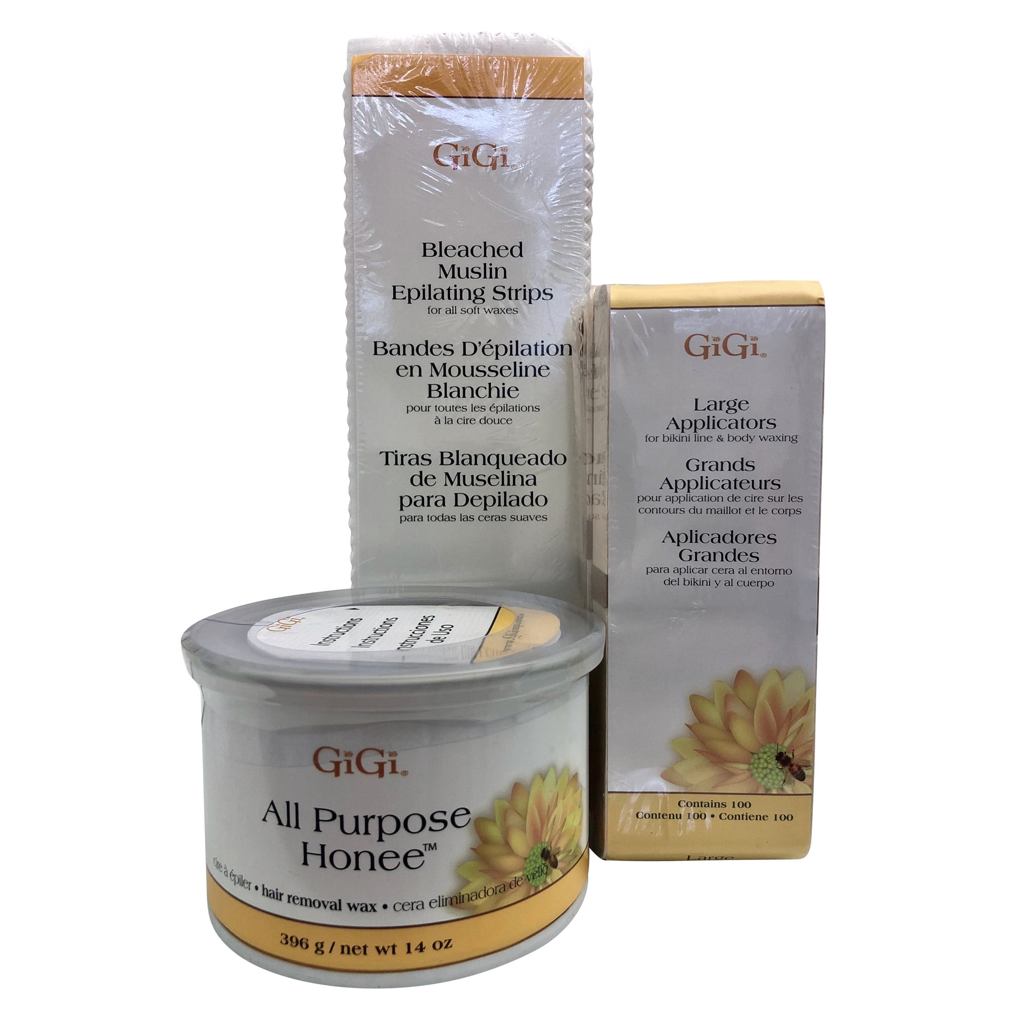GiGi Bleached Muslin Epilating Strips, Large Applicators & All Purpose Honee Set offers you all the must haves for the perfect and skin smoothing wax on legs, arms, and bikini area. Muslin Epilating Strips are all natural, maximum absorbing, and offer a clean and gentle wax removal. Large applicators are perfect for larger areas. Made of natural wood and disposable. GiGi All Purpose Honee is an all natural flexible wax for all skin types and hair types. Flexible formula allows you to get the best results without having to use a Muslim Cloth.Professional Use, At Home Use, High Qualioty, Disposable, All Wax Types, Face, All Skin Types, All Hair Types
