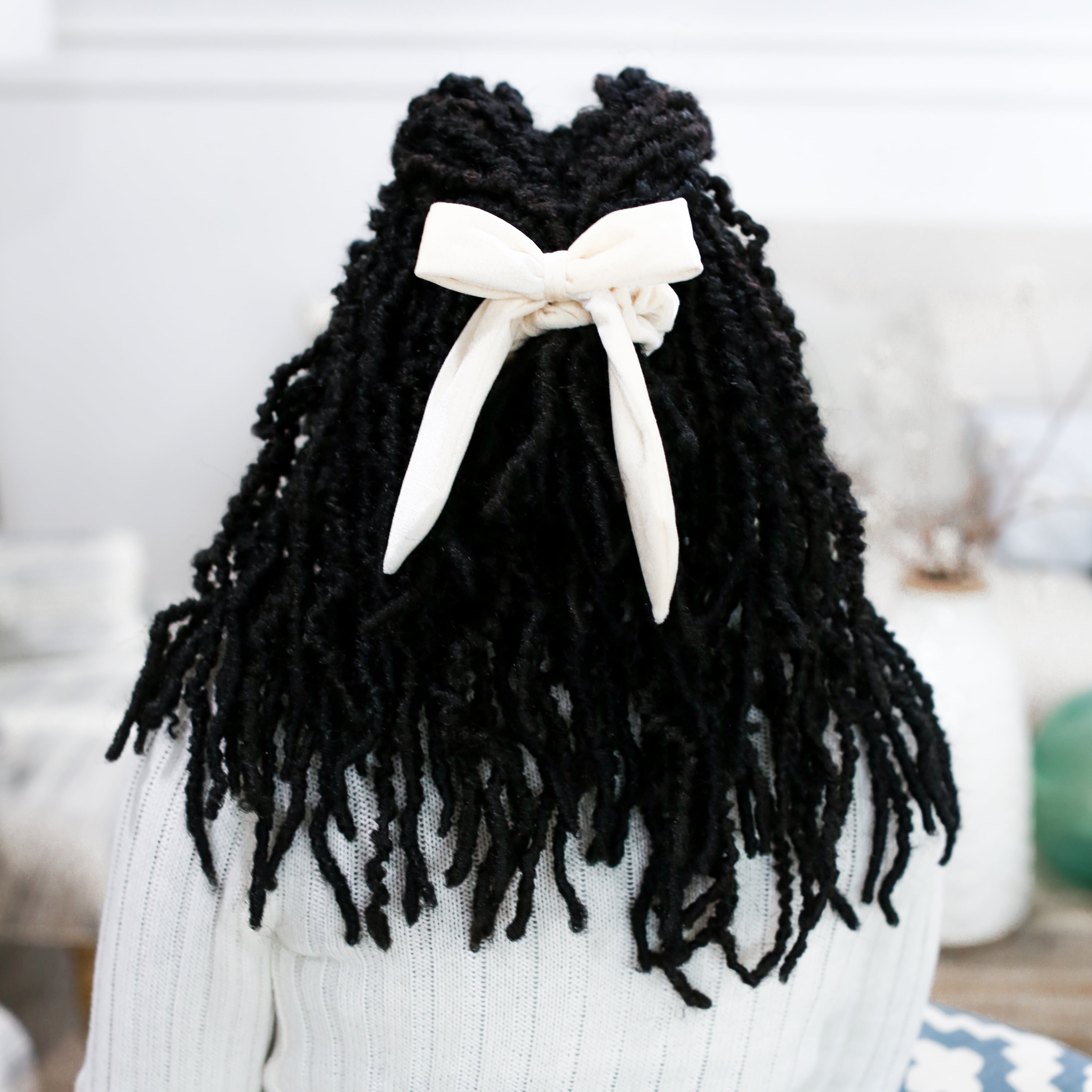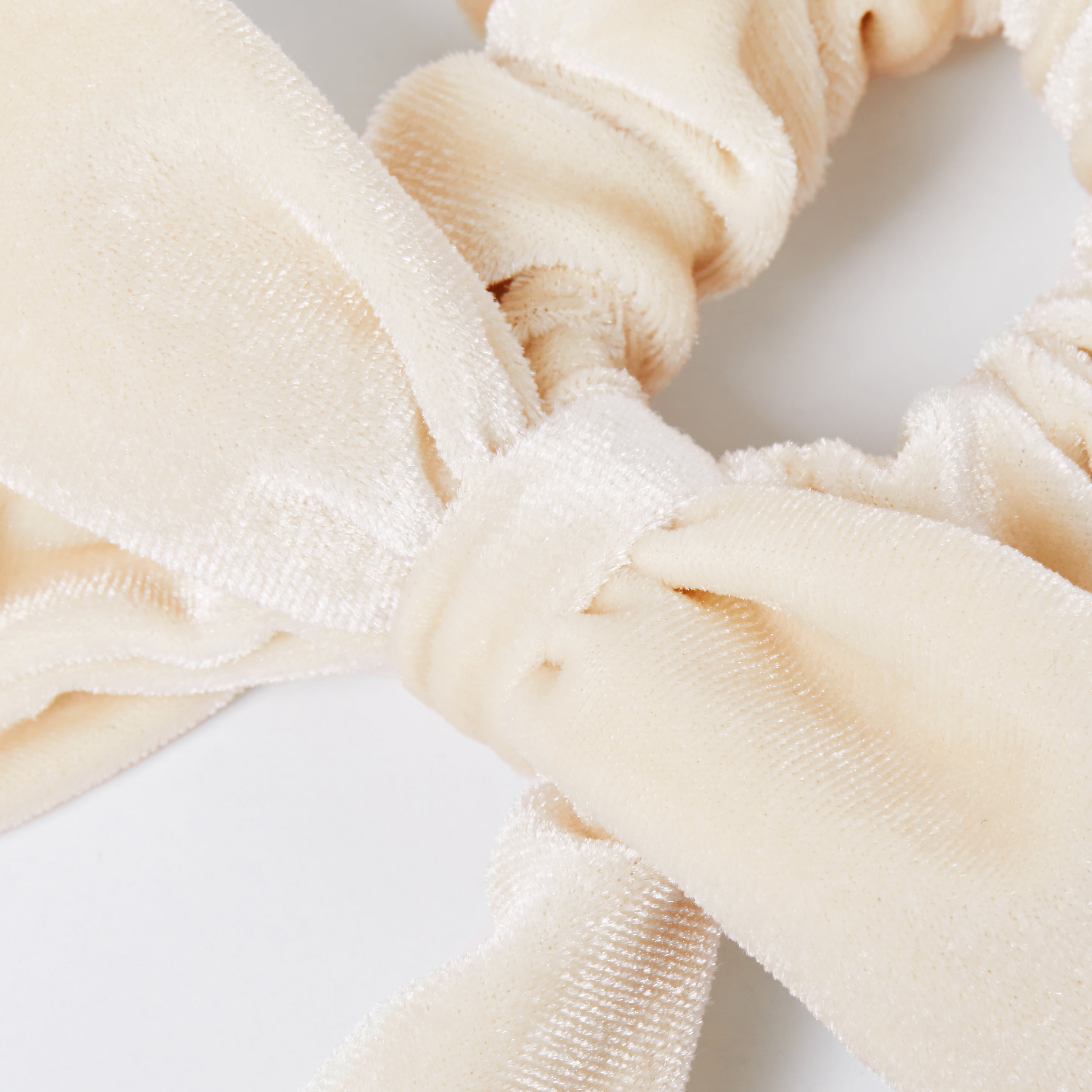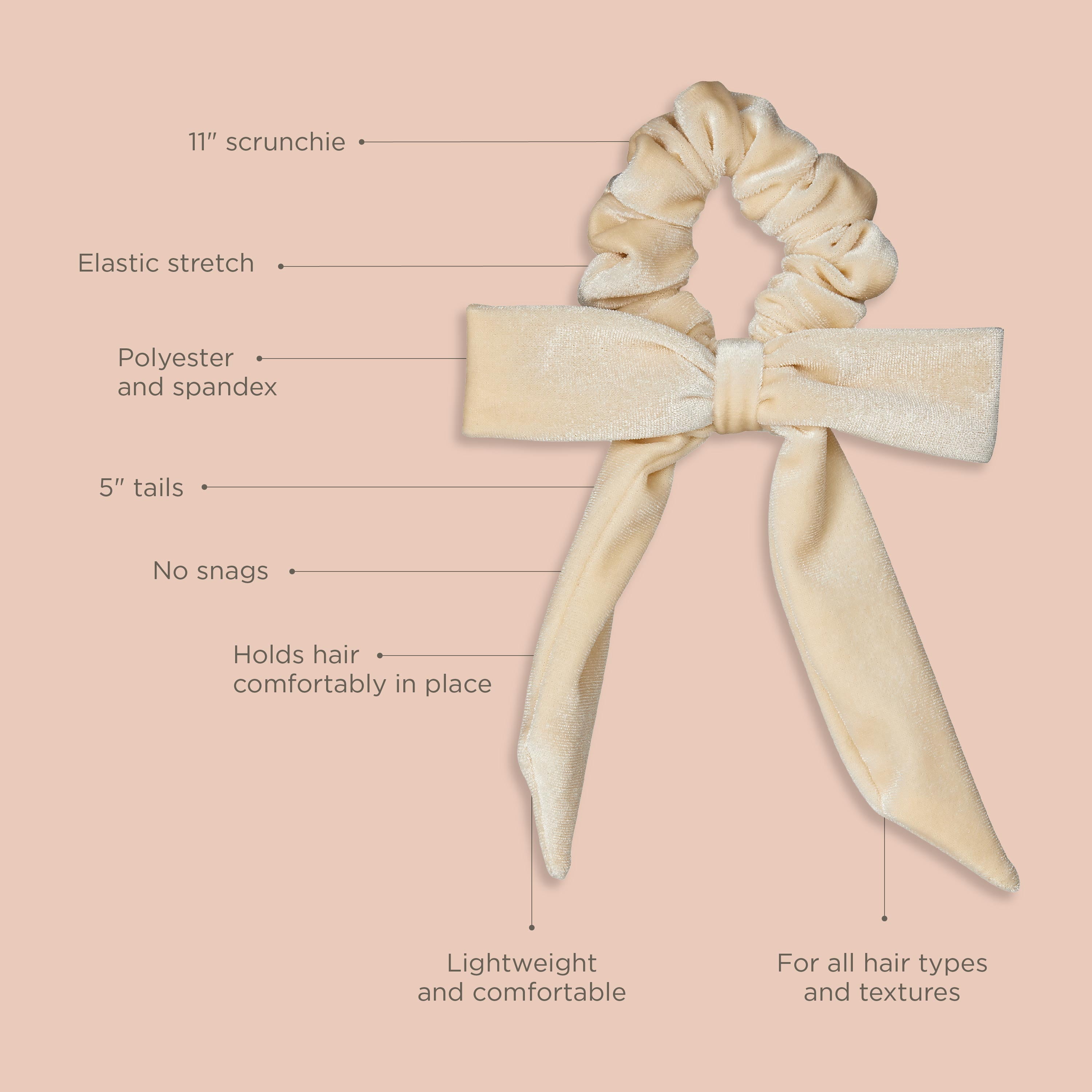 This sleek velvet hair scrunchie featuring a bow embellishment is the perfect accent to your ponytail or braid.