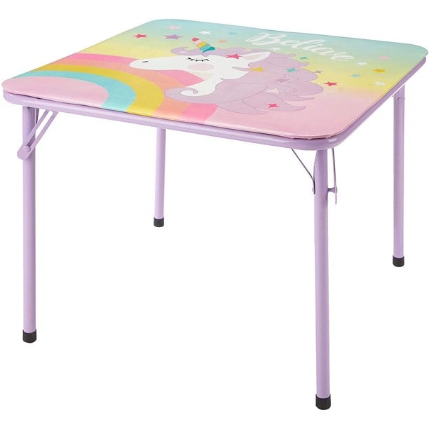 Add more unicorns into your little ones life with this 3 piece table and chair set! This set comes with a foldable table and two padded chairs that is perfect for sitting at to do homework, activities and eating. The sturdy metal frame is foldable – easy storage when your child is not using it. Chair dimensions: 10.5" L x 12.13" W x 20" H. Table dimensions: 24" L x 24" W x 18.5" H
