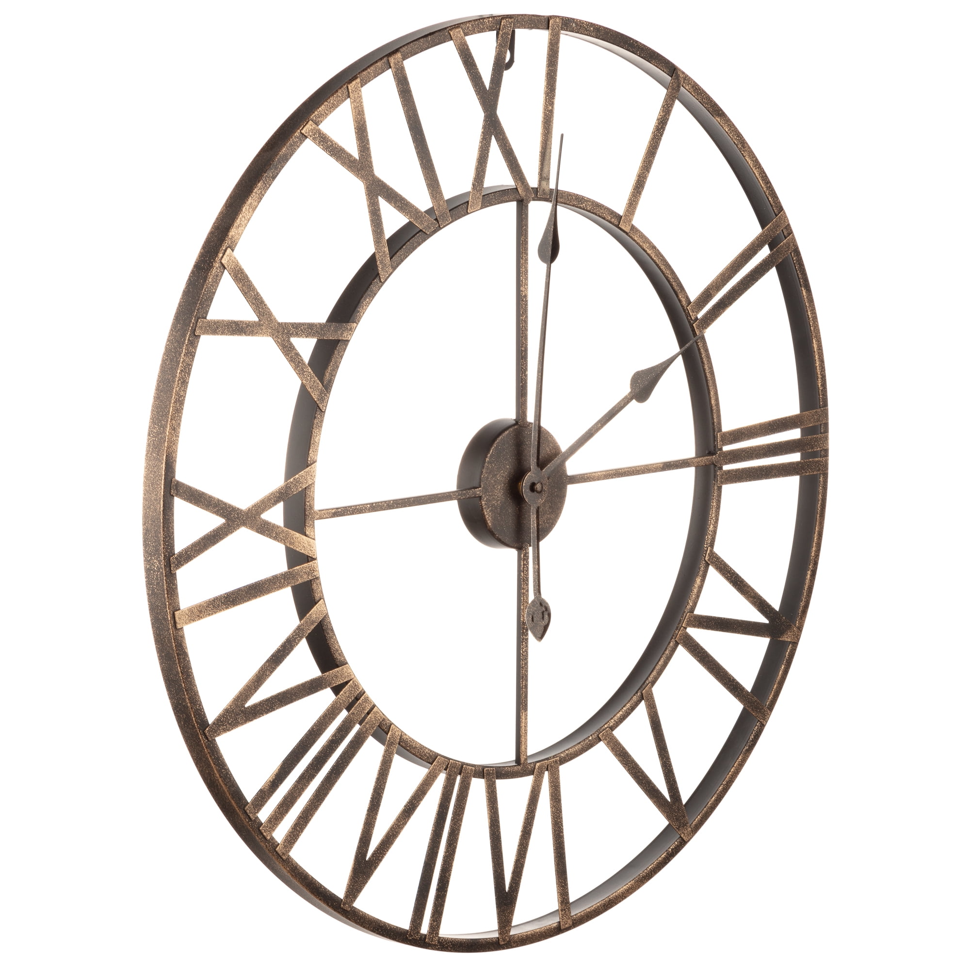 This attractive wall clock has a sleek cut out design. Crafted from iron, the clock has a distressed black and dark bronze finish. Roman numerals on the clock. Versatile clock would look fabulous in farmhouse, industrial, or modern settings and will look great in just about any room!