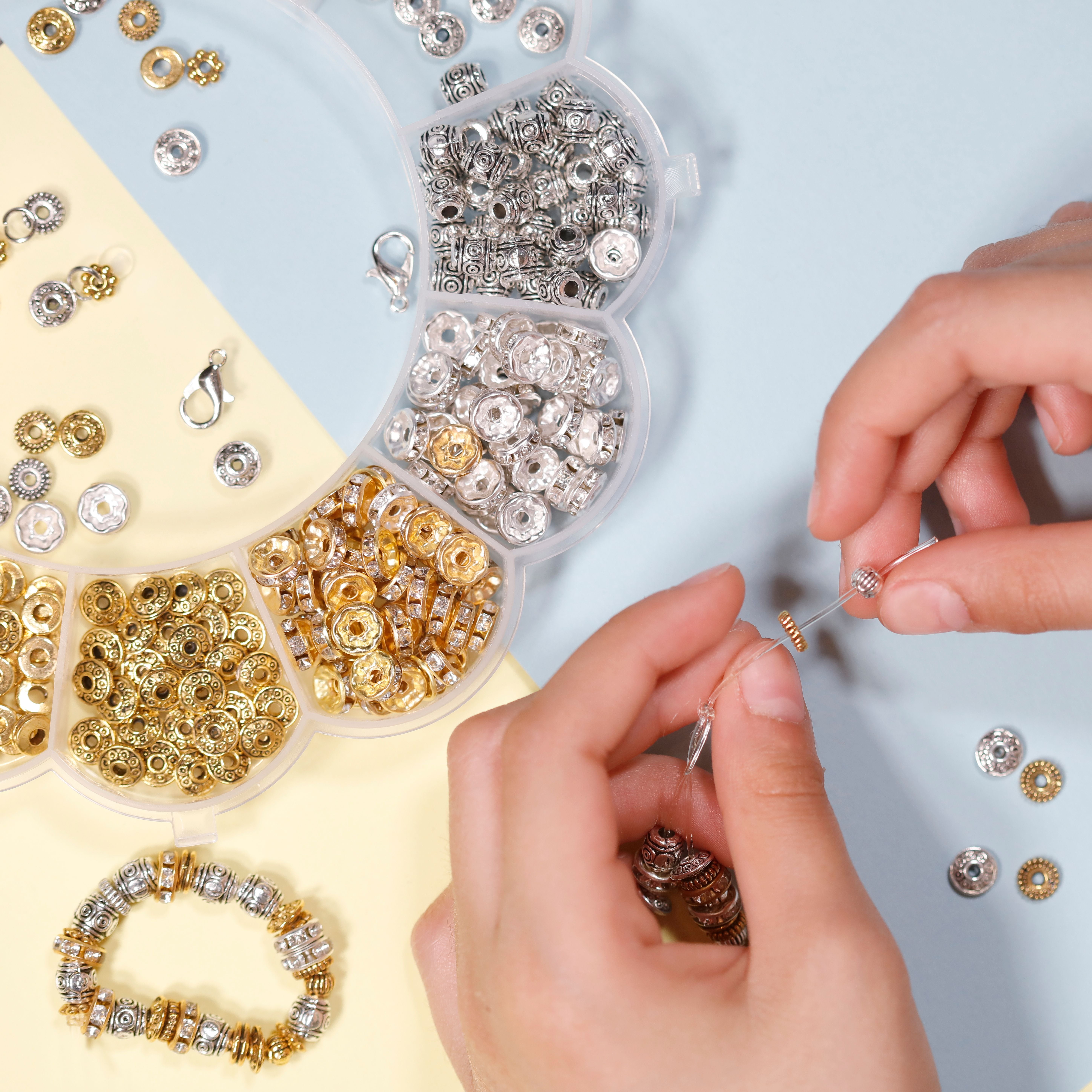 - VALUE PACK: Each bulk package includes 12 styles (6 Silver & 6 Gold) 600pcs spacer beads including 50 pcs each of Tibetan style balls, Rondelle crystal spacer beads, 3D flower beads, Rhinestone beads & regular spacer beads. This set also includes Elastic thread, 15 pcs Clasps, 15 pcs Jump rings & Organizer box.