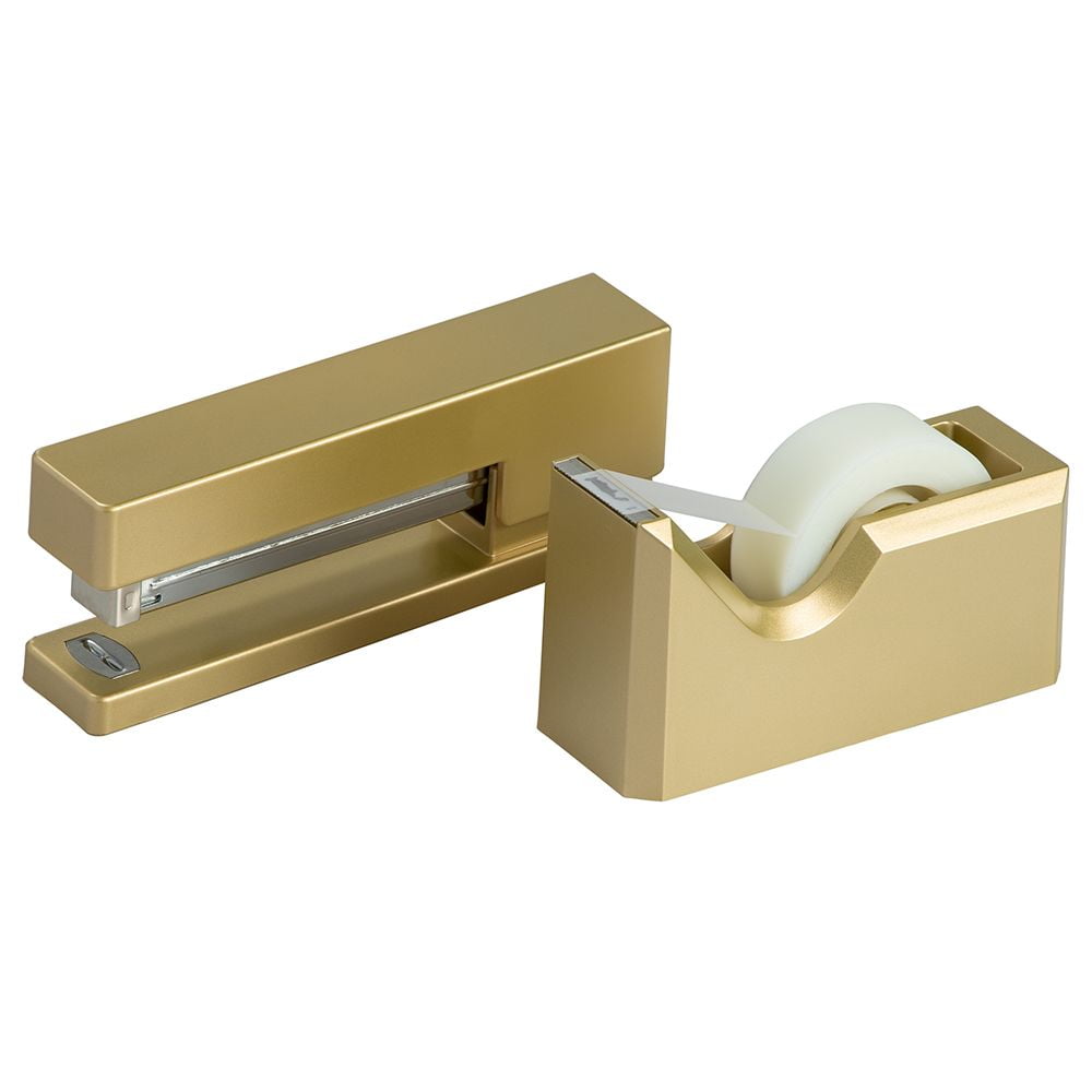 JAM Paper Gold Office Desk Set, 1 Stapler & 1 Tape Dispenser is what your need to bring some luxury to your desk! Each tape is made of durable plastic. To keep your tape in one spot, this dispenser has a weighted bottom. It is sized to for standard rolls of clear tape & reloads with a removable plastic wheel. The stapler is made of durable plastic and sturdy metal! This weighted stapler has a black rubber lining on the bottom. Size: Tape dispenser – 4 1/2in x 2 1/2in x 1 3/4in, Stapler- 6in x 11 1/2in x 1 1/8in | Color: Gold | Quantity: 2/Pack