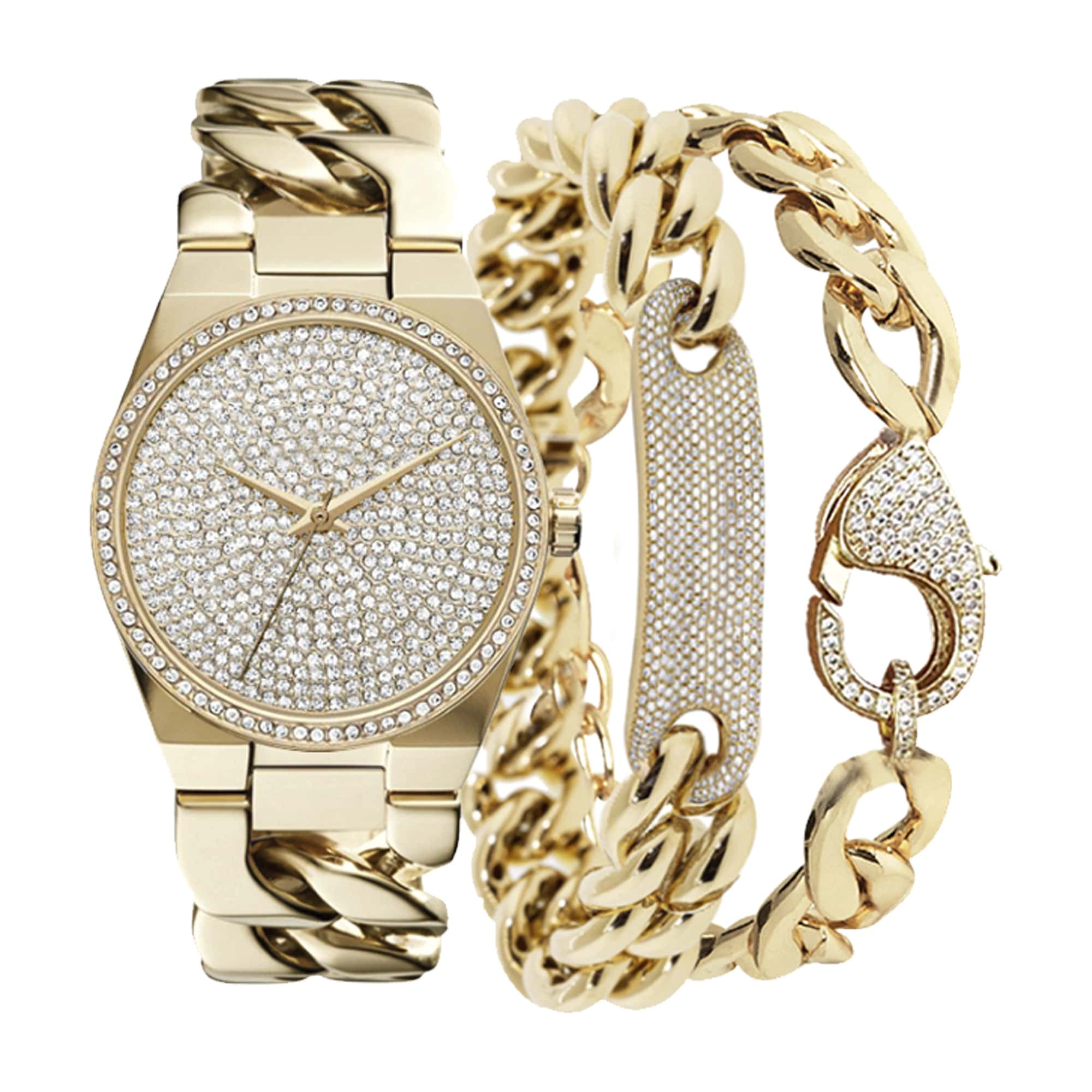 Luxury and elegance become one in this Kendall + Kylie crystal face watch and matching bracelet set with this chic and modern timepiece is sure to turn heads, and the matching bracelet makes fashionable accessorizing easy. Treat yourself to something nice and slip your hand into one of these, you won’t regret it.