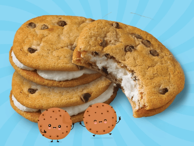 - 64 individually wrapped soft chocolate chip cookies sandwiched between a layer of vanilla creme.