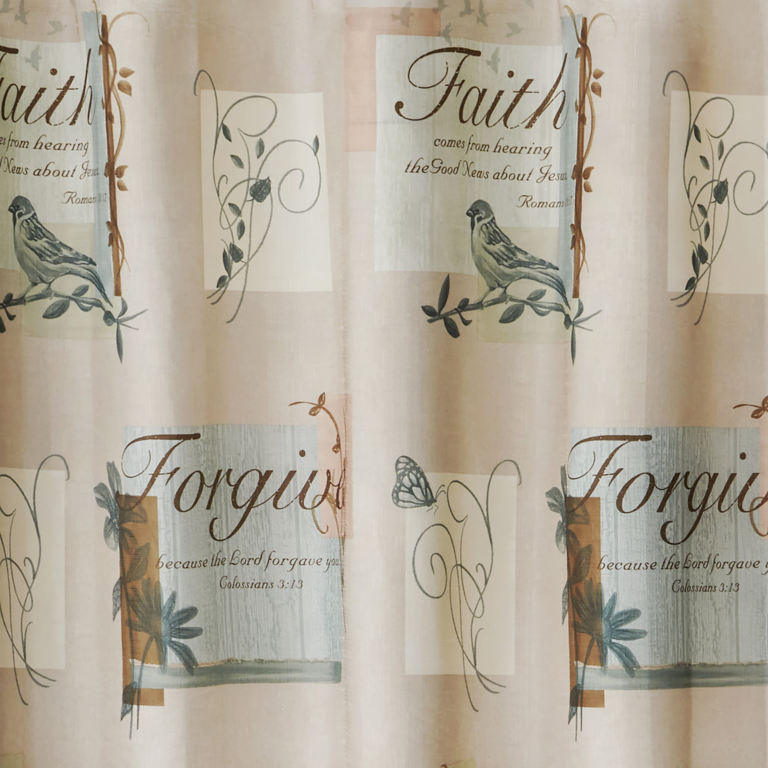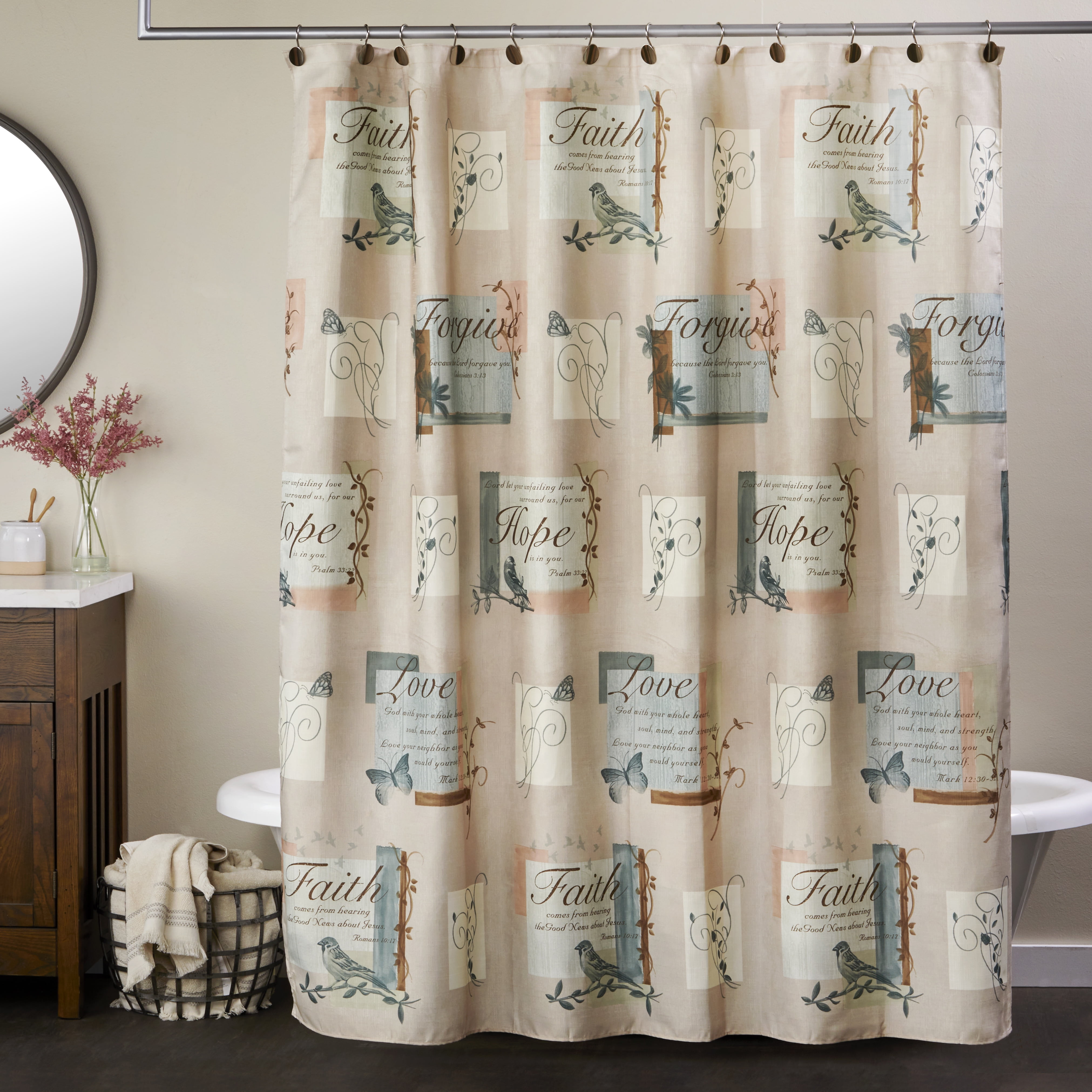 - Lightweight fabric shower curtain with inspirational words, biblical verses, flowers, butterflies and birds