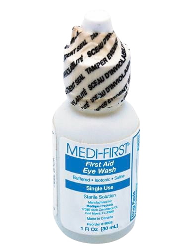 Medi-First 1 Oz. (30 mL) Sterile Eye Wash, Sterile isotonic buffered eyewash and skin flushing solution for irrigating the eye to help relieve irritation, discomfort, burning, stinging or itching by removing loose foreign material, air pollutants (smog or pollen), or chlorinated water. Available in multiple sizes, this Eye Wash product is accessible for industrial and home first aid kits. DISCLAIMER: ALL PICTURES SHOWN ARE FOR ILLUSTRATION PURPOSE ONLY. ACTUAL PRODUCT MAY VARY DUE TO PRODUCT ENHANCEMENT.Expiration – September-2024