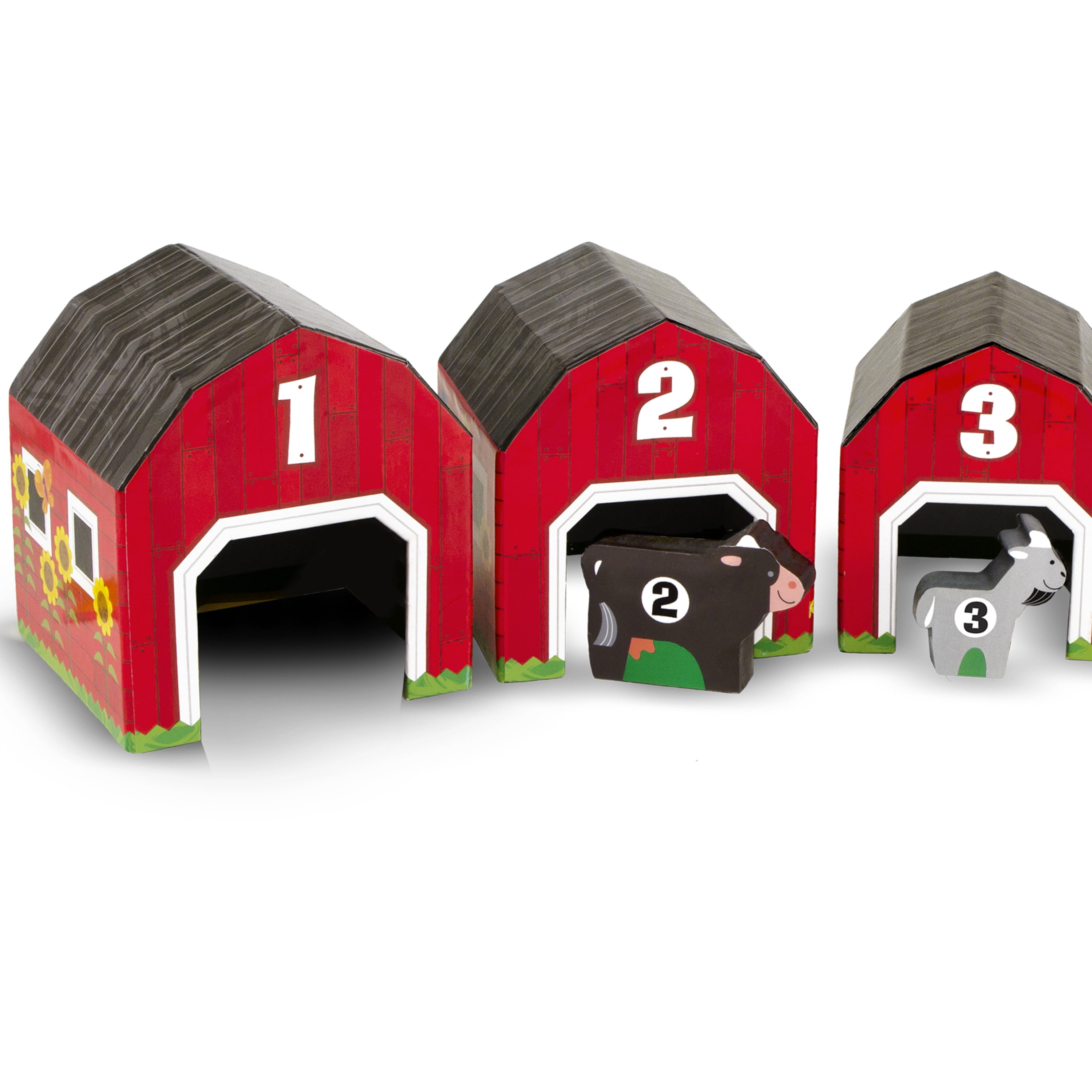 - Colorful barns feature counting pictures on the back walls.