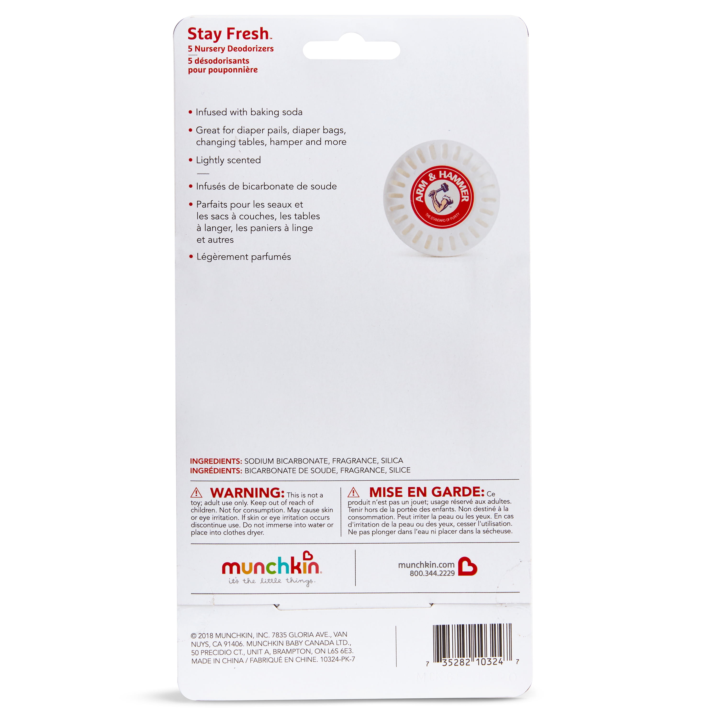 This handy 10 pack of Arm and Hammer Nursery Fresheners harness the power of baking soda in a portable freshener that can be used just about anywhere. These ten deodorizing discs that are filled with odor eliminating baking soda and scented with lavender or citrus are great for diaper bags, diaper pails, changing tables, hampers and more. Not intended for use as a replacement in the lid of Munchkin Diaper Pails. Multi-purpose air freshening discs for household use.