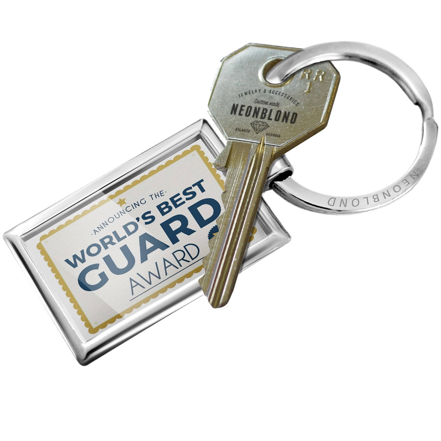 NEONBLOND’s key chains / key rings are a unique and perfect gift, ideal for house and car keys. You need a Black Friday Stocking stuffer or a Christmas Gift? We have more than 90,000 different keychain products all assembled the USA! Standard Size measures approximately 3" X 1", including key ring Money-back Satisfaction Guarantee Made in Atlanta ,GA.NEONBLOND Keychain Worlds Best Guard Certificate Award