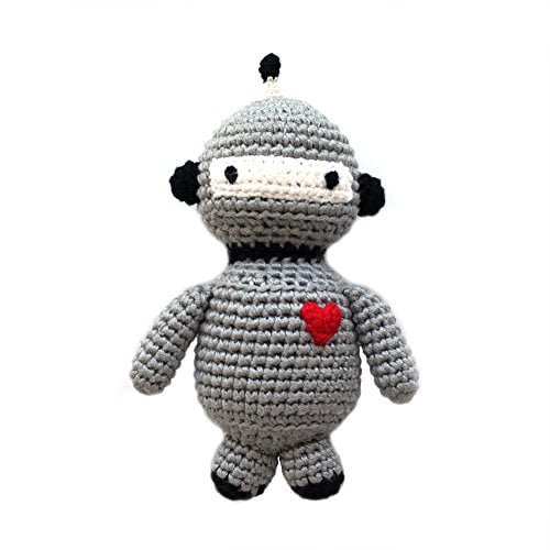 We adore this cute little robot rattle, and we think you will too! Hand knit from super soft bamboo yarn, baby will love the texture and gentle rattle sound. Would make a unique gift for baby and excellent addition to our Make Your Own Gift Basket!Features:Handcrafted from organic bamboo yarnFair TradeApproximately 5 inches