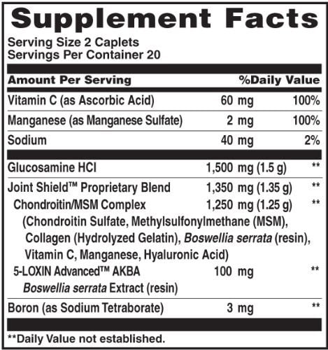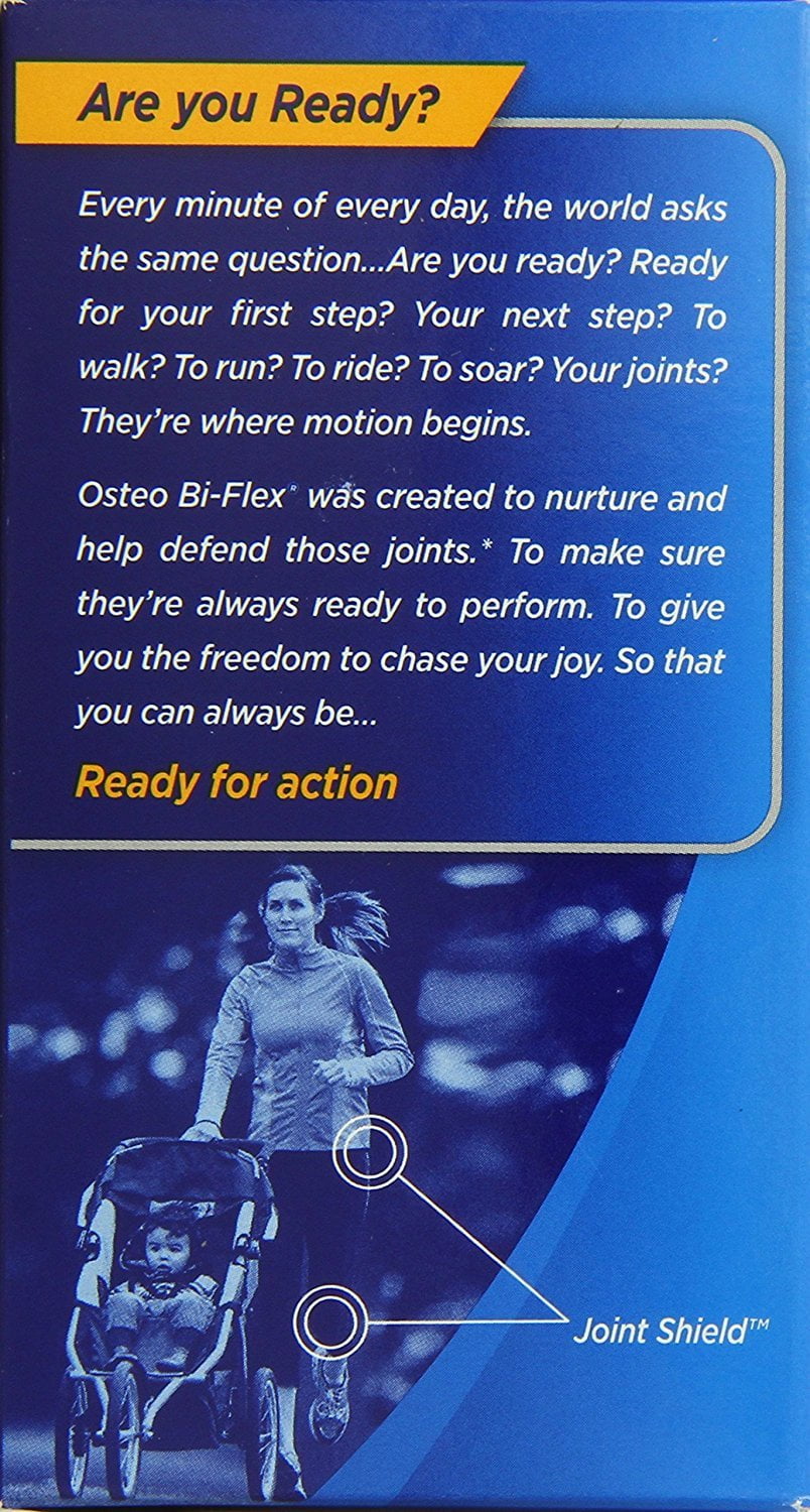 The brand doctors recommend most for joint health. Active Ingredients: Per 2 Gelcaps: Vitamin C (as Ascorbic Acid) 60 mg; Manganese (as Manganese Sulfate) 2 mg; Sodium 30 mg; Glucosamine HCl 1500 mg (1.5 g); Joint Shield Proprietary Blend 1350 mg (1.35 g) (Chondroitin/MSM Complex 1250 mg [1.25 g] [Chondroitin Sulfate; Methylsufonylmethane {MSM}; Collagen {Hydrolyzed Gelatin}; Boswellia Serrata {Root}; Vitamin C; Manganese; Hyaluronic Acid]; 5-LOXIN AKBA Boswellia Serrata Extract 100 mg); Boron (as Sodium Tetraborate) 3 mg; Crospovidone; Cellulose Coating; Polydextrose; Vegetable Magnesium Stearate; Titanium Dioxide Color; Silica; Sodium Citrate; Magnesium Silicate; PEG; Coconut Oil; Cellulose (Plant Origin) Uses: Overexertion, the natural aging process and everyday wear and tear can take their toll. Annoying flare-ups can strike at any time. Now there’s a new choice to support healthy joints.* New Osteo Bi-Flex Advanced Triple Strength with Joint Shield is a revolutionary new formula that contains the unique ingredient 5-Loxin. By targeting a distinct pathway in the body, its mechanism of action supports cartilage by guarding against the action of enzymes that affect joint health.* Additionally, Osteo Bi-Flex Advanced Triple Strength helps protect cartilage and helps with annoying flare-ups while renewing the cellular components within joints.* The key ingredient in Joint Shield is a potent extract of Boswellia serrata called 5-Loxin, which is 10 times more concentrated than typical Boswellia extracts. The 5-Loxin in Joint Shield helps with joint flare-ups, and Boswellic extracts have also been shown to significantly improve knee comfort, knee mobility and increase walking distance.* Osteo Bi-Flex Advanced Triple Strength with Joint Shield is a potent synergistic combination of the latest in Joint Care Science, specifically designed for those individuals who are serious about protecting and strengthening their joints.*