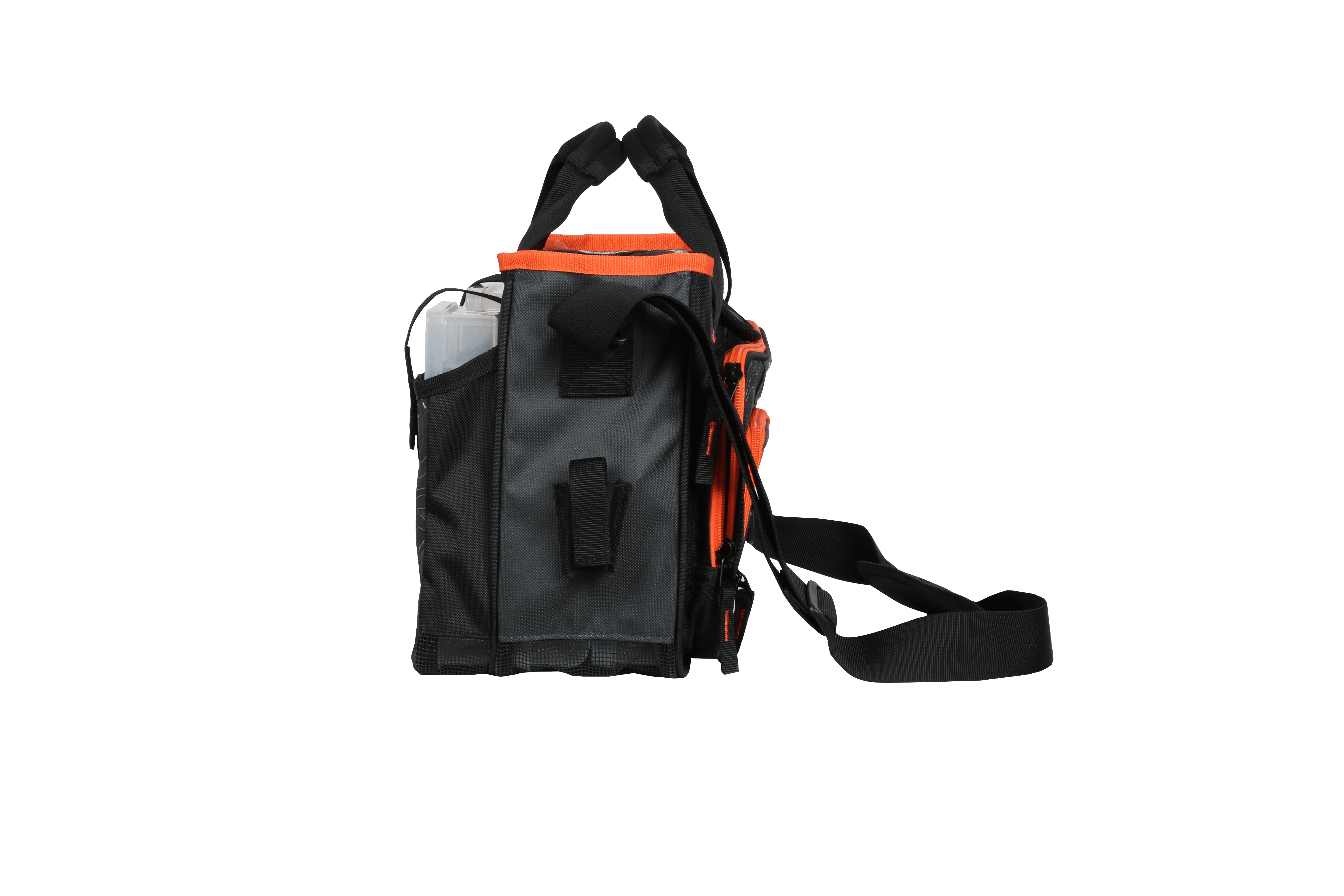 Stay prepared and organized while fishing with the Ozark Trail Shoreline Tackle Bag in black topography print with orange accents. This bag is perfect for anglers of all levels and will allow you to take everything you need to be successful on your next lake day. With plenty of storage space, this bag will help you make the most of your next fishing trip. This bag features four utility boxes (two 3700 trays and two 3500 trays), two secure back pockets for accessories or additional trays, a large accessory pocket, and a front zipper pocket for tools. And with a dipped mesh bottom, this bag is both durable and easy to clean. For more comfortable carrying, the Ozark Trail Shoreline Tackle Bag features a padded carry handle and adjustable shoulder strap. Are you ready for your next fishing trip. If so, make sure to grab the Ozark Trail Shoreline Tackle Bag so you can take everything you need to reel in that trophy catch.