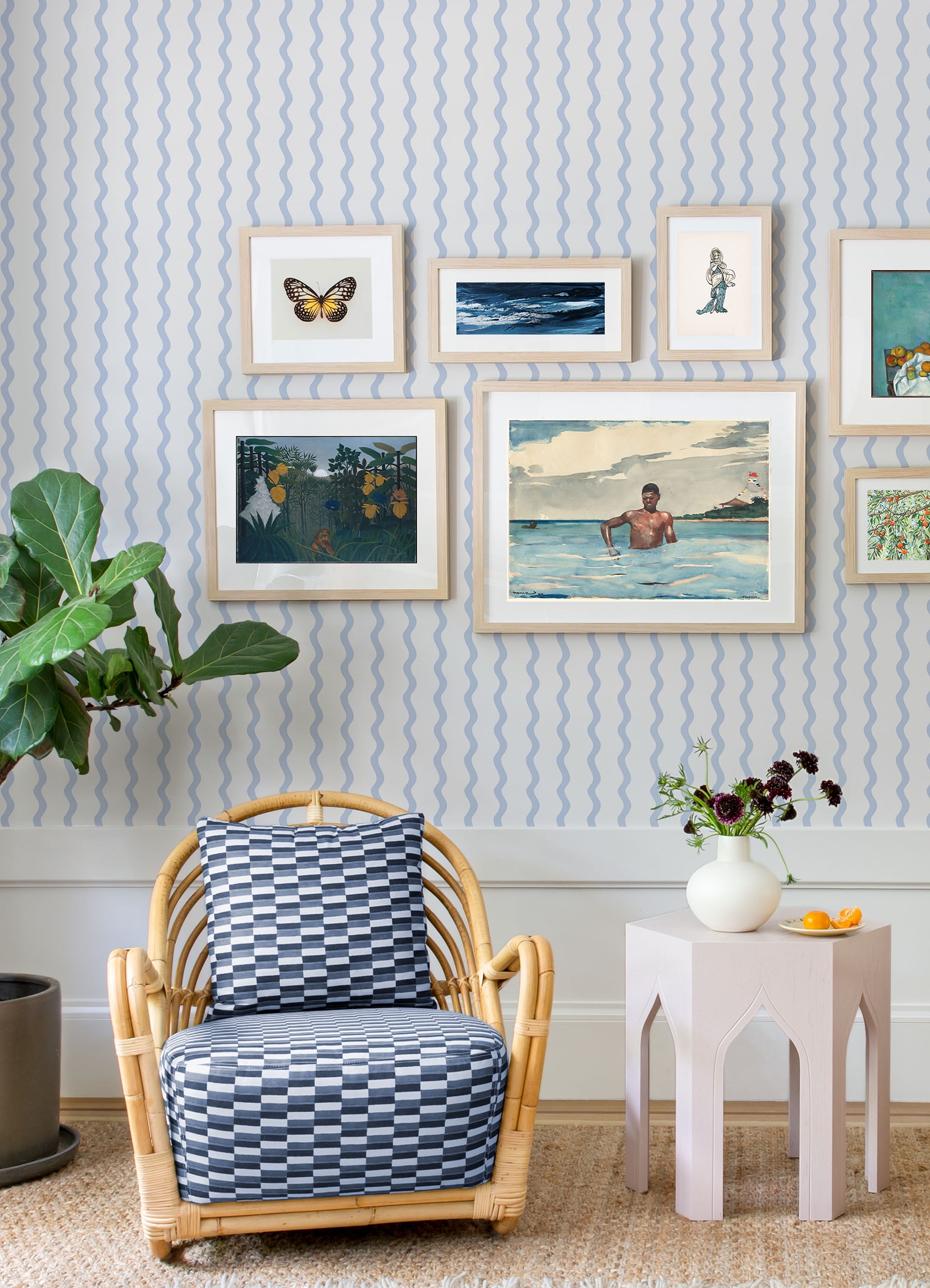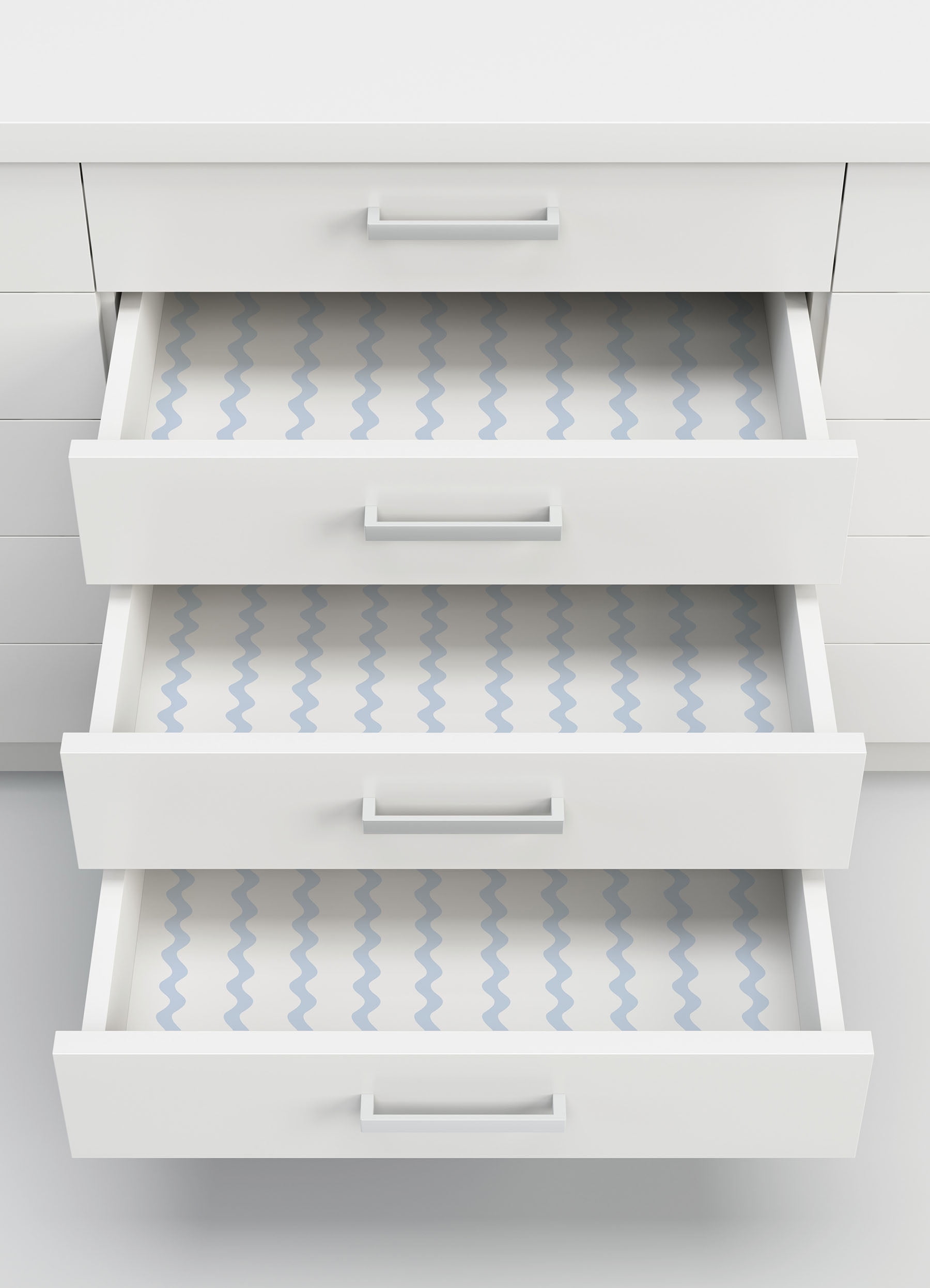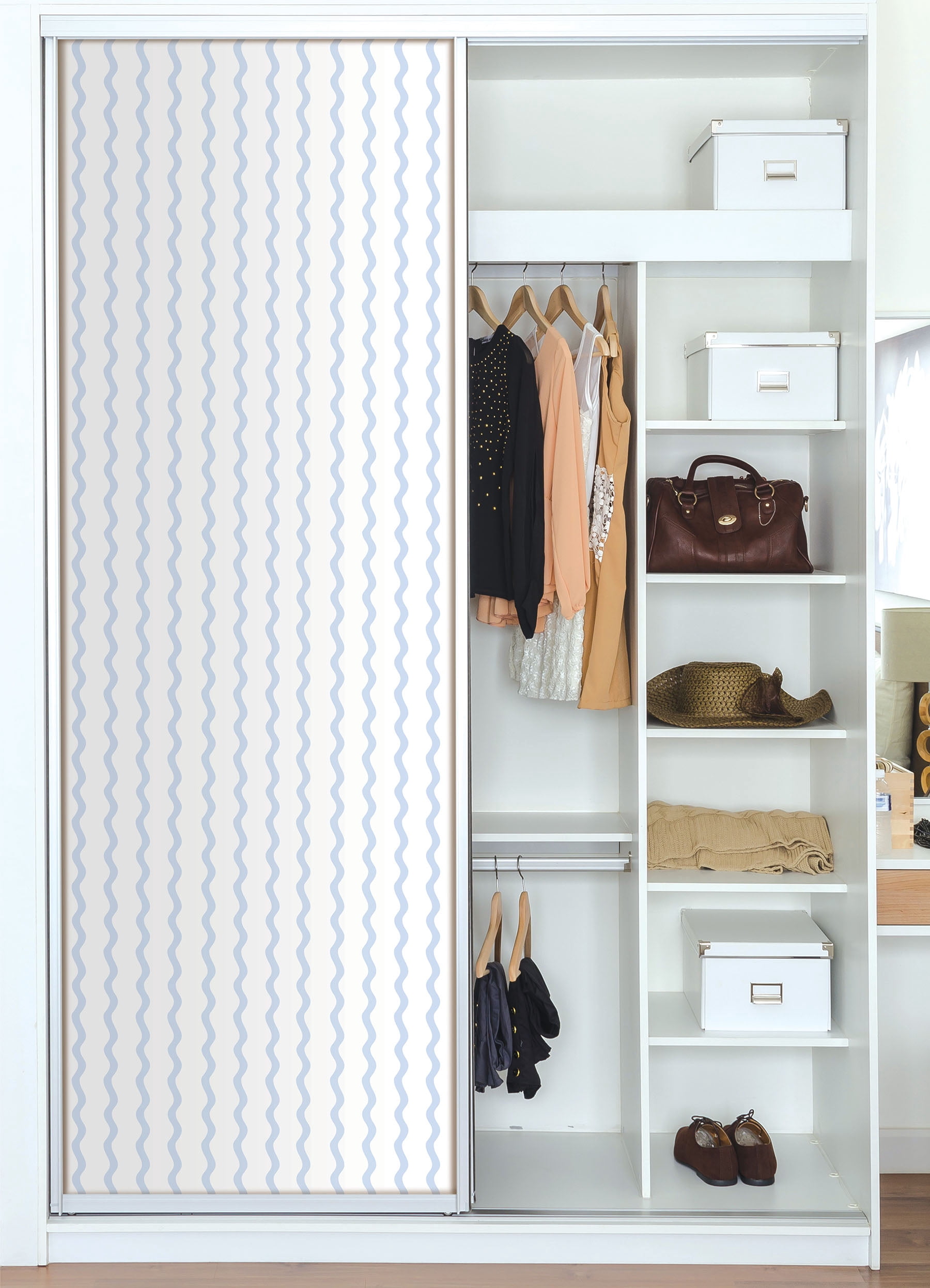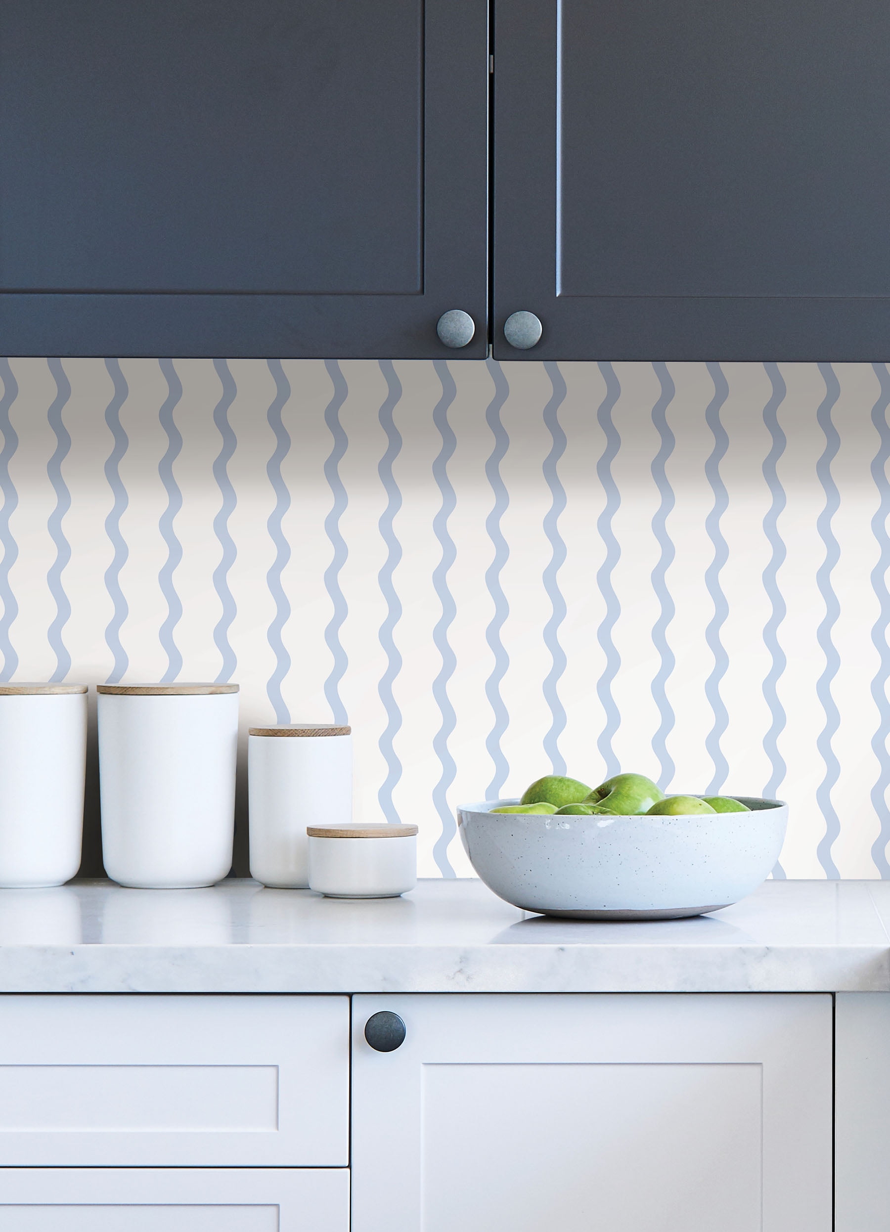 - Blue and white peel and stick wallpaper featuring a wavy stripe pattern