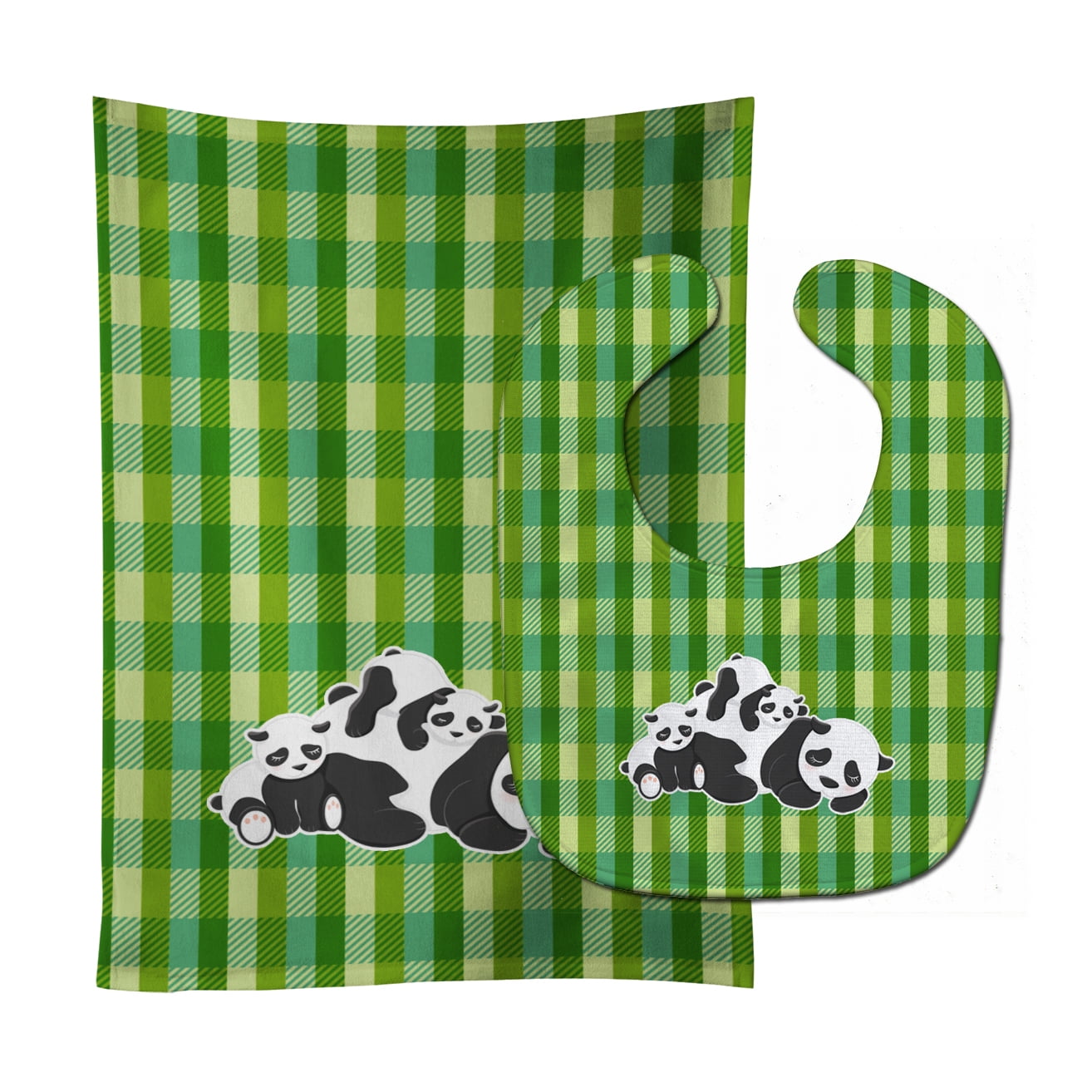 Baby Bib and Burp Cloth Set that is both Cute and Functional. Dyed plush fabric baby bib with Velcro closure. Made of ultra-smooth micro-mink polyester that reverses to 100% cotton terry loops. Measures 10 inches x 13 inches, 0.8 oz. per piece. Edges are finished with binding. Plus a Dyed plush fabric baby burp cloth. Made of ultra-smooth micro-mink polyester that reverses to 100% cotton terry loops. Measures 11 inches x 18 inches, 0.8 oz. per piece. Edges are finished with binding. Machine washable and dry on low heat. Fade resistant and stain resistant. Top fabric gets even softer after the first wash.Pandas Baby Bib & Burp Cloth
