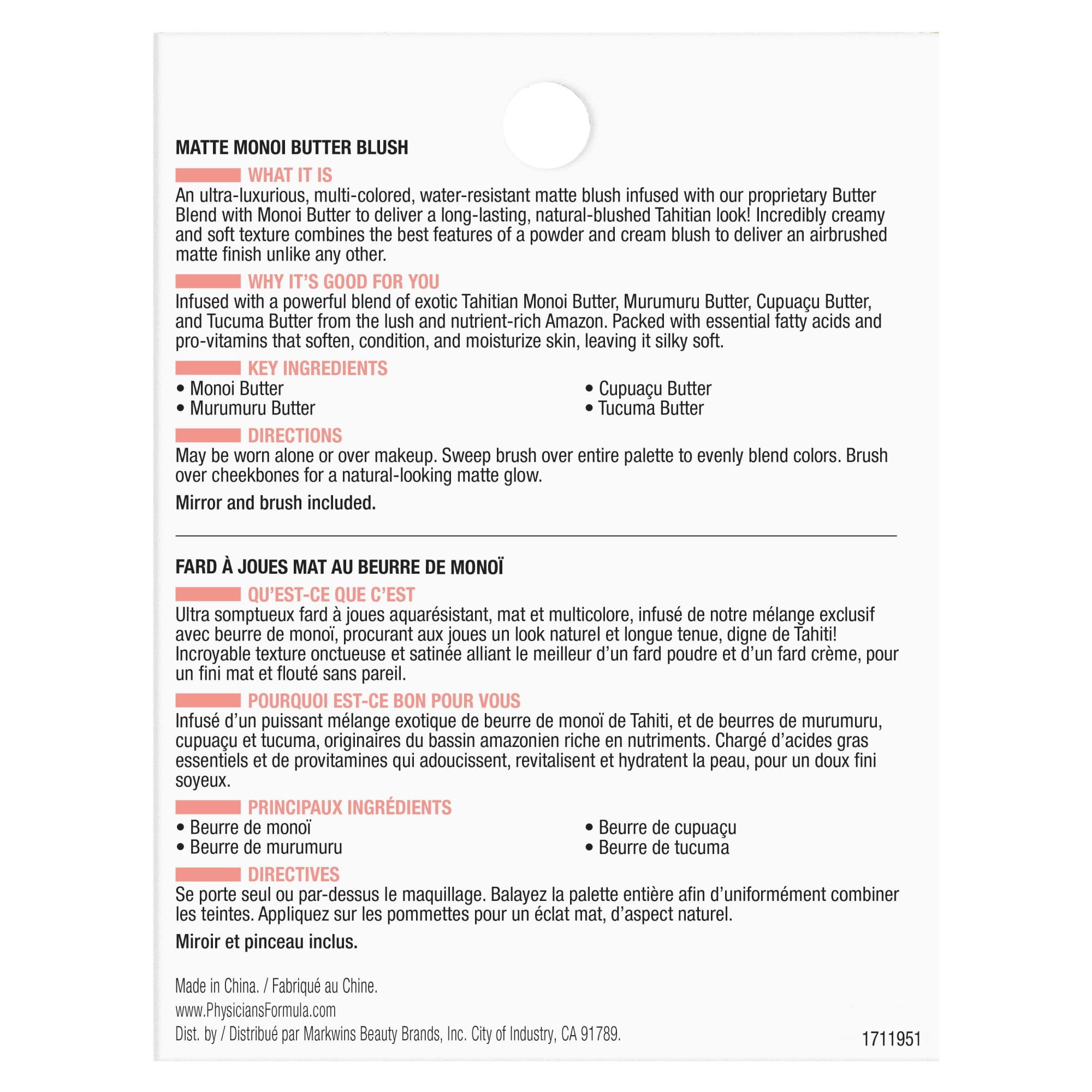 Escape to paradise with this luxuriously creamy Matte Monoi Butter Blush from Physicians Formula. Based on our iconic butter blend of Murumuru Butter, Cupuacu Butter, and Tucuma Butter, this enhanced blush adds Tahitian Monoi Butter to mix for a luxuriously creamy, skin-loving blush that kisses your skin with a warm splash of natural color. Add in a long-lasting matte finish, and the goodness of essential fatty acids and pro-vitamins, and you’ve got a skin-conditioning, water-resistant blush that makes you look and feel radiant.Blushing Island Glow: Give your face the radiant goddess glow of the tropics. This ultra-creamy blush delivers a long-lasting natural-blushed Tahitian look to your face while providing a gorgeous water-resistant matte finish.