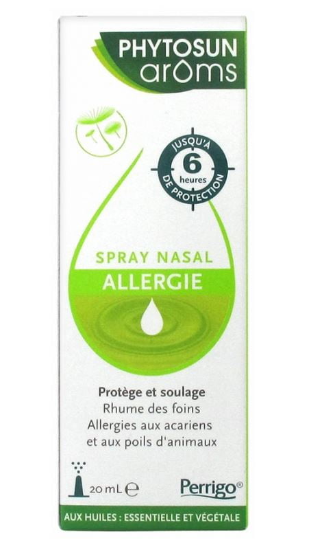Phytosun Arôms Allergy Nasal Spray 20ml is a spray that protects for 6 hours and acts quickly and safely from the first symptoms of allergic rhinitis (sneezing, runny nose, watery eyes, blocked nose). is a spray that protects for 6 hours and acts quickly and safely from the first symptoms of allergic rhinitis (sneezing, runny nose, watery eyes, blocked nose). It is effective in case of allergies to pollen, mites and animal hair. It is a patented Thixotropic formula: the spray becomes fluid once shaken for easy dispersion and then regains its gel consistency on the nasal mucous membranes to block contacts with allergens. Based on essential and vegetable oils, it has no drowsiness effect, no antihistamine and no cortisone. It can be used in pregnant or nursing women.Phytosun Aroms Allergy Nasal Spray 20ml