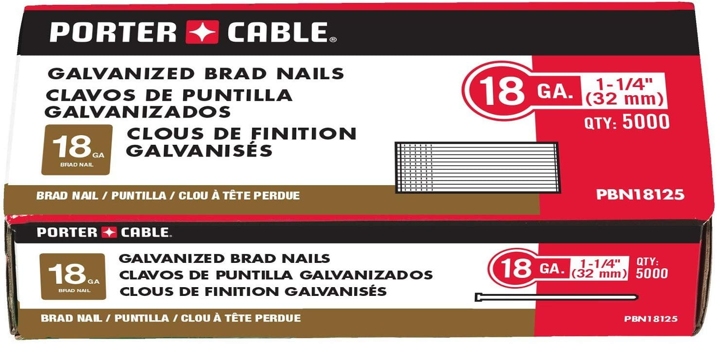 The PORTER-CABLE PBN18125 18 Gauge 1-1/4-Inch Brad Nail is ideal for fastening case corners, drawers, cabinets, picture frames, molding, and decorative trim. 18 gauge fasteners, galvanized coating, with a chisel point. For use in Porter Cable model BN138, BN200B; DEWALT D51236K, D51238K, DC608K; BOSTITCH: BT35B, BT50B, BT200K-2, SB-1842BN, SB-1850BN, SB-2IN1. Can also be used with HITACHI NT32AE2, NT50AE2; PASLODE T125-F18, T200-F18, IM200F18; SENCO F15, FP18, FP25XP, SLP20; and RIDGID R213BNA.