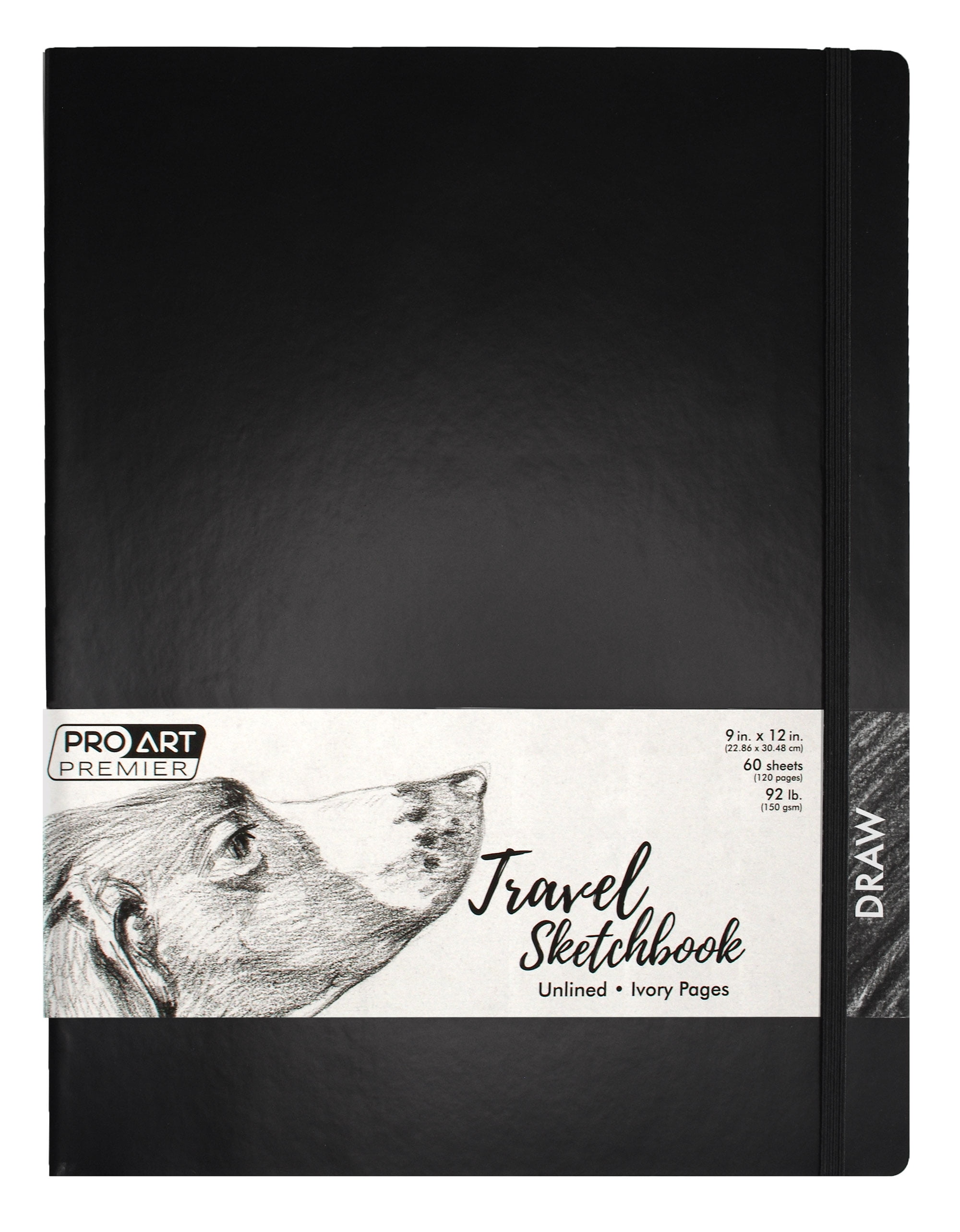 Pro Art Premier Travel Drawing Book 12"x 9" Ivory 92lb Black 60sht- Durable, sewn bound book fits easily into your pocket, bag, or art box. Acid free, recycled drawing paper has a smooth finish that makes it perfect for drawing, journals, notes, and more. Black, Italian made cover, is durable and flexible. Includes coordinating elastic closure, ribbon marker, back cover pocket, and 120 pages/60sheets of 92lb/150gsm ivory paper.Pro Art Travel Drawing BK 12×9 120pg Ivory 92# Blk