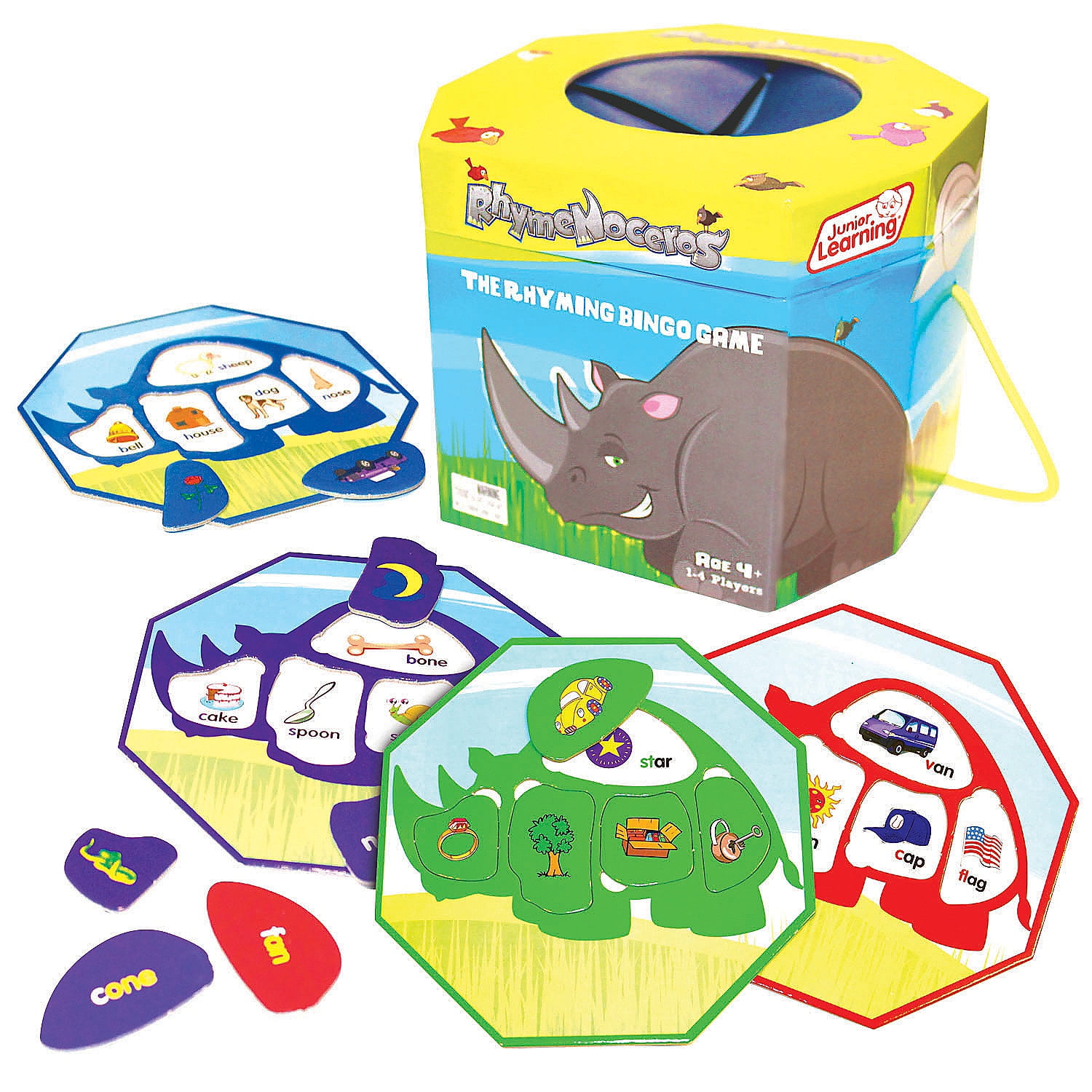 The rhyming bingo game. Match the object that you find in the Rhymenoceros lake to the picture that rhymes on your rhino puzzle board. Teach recognition of rhyming words matching rhyming sounds and phonemic awareness. Contains: 4 rhino puzzle boards 20 object cards storage box and a game guide.Builds rhyming knowledge early phonological awareness oral language sorting and fine motor skills. Cards show matching image on one side and word with highlighted rhyme on the reverse. Unique puzzle cut enables self correction. Each cauldron contains a handy draw to store bingo boards underneath. Contains 4 bingo puzzle boards 20 game cards and a Rhymnoceros feely box. For1 to 4 players. Ages 4 to 7 years old. Box 7" x 7".Fun Express – Rhymenoceros Game – Educational – Teaching Aids – Language Arts – 25 Pieces