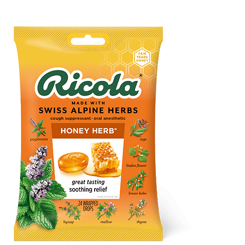 Ricola Honey Herb takes the unique flavor of our classic drop and softens it with real golden honey. Providing a taste your whole family will be buzzing about. Ricola Honey Herb can be used for soothing relief of coughs and sore throats. And always contains our unique blend of mountain grown Swiss herbs.