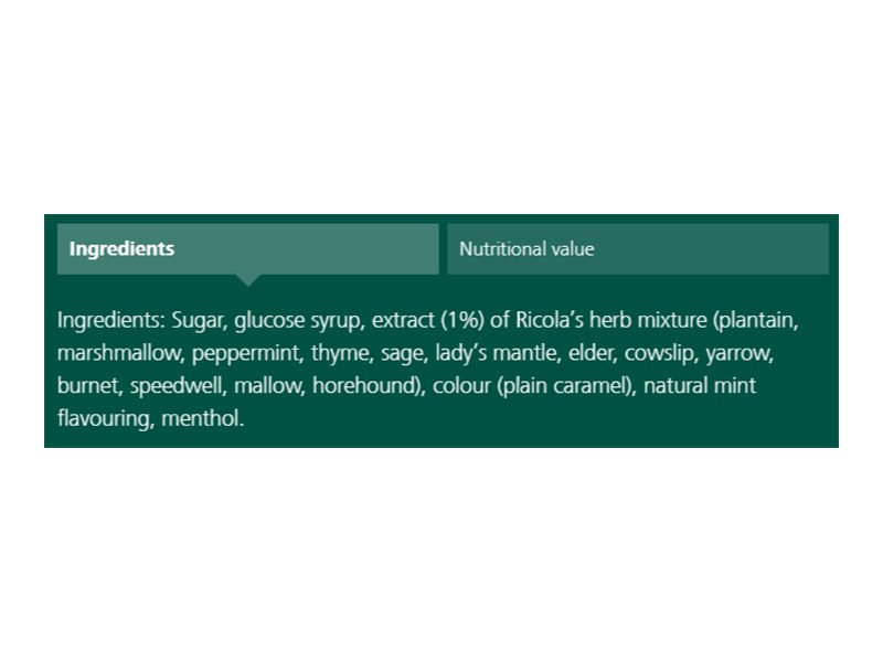 Ricola Natural Herb Cough Drops Original. The cough suppressant – throat drops. With natural menthol and Ricola’s special 10-herb blend combine to make Ricola original natural herb cough drops uniquely delicious and effective. Temporarily relieves cough due to a cold or inhaled irritants and occasional minor irritation and pain due to sore throat or sore mouth.