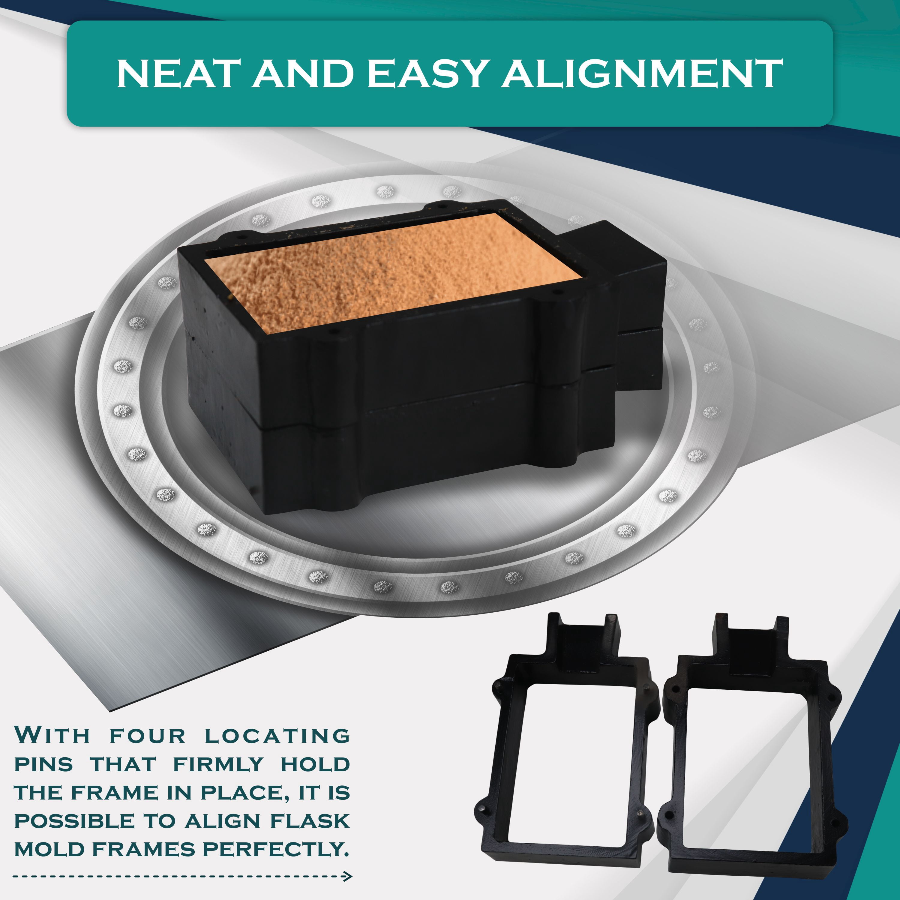 - Neat and Easy Alignment: Correct alignment of flask mold frames is feasible with four locating pins which hold the frames firmly.