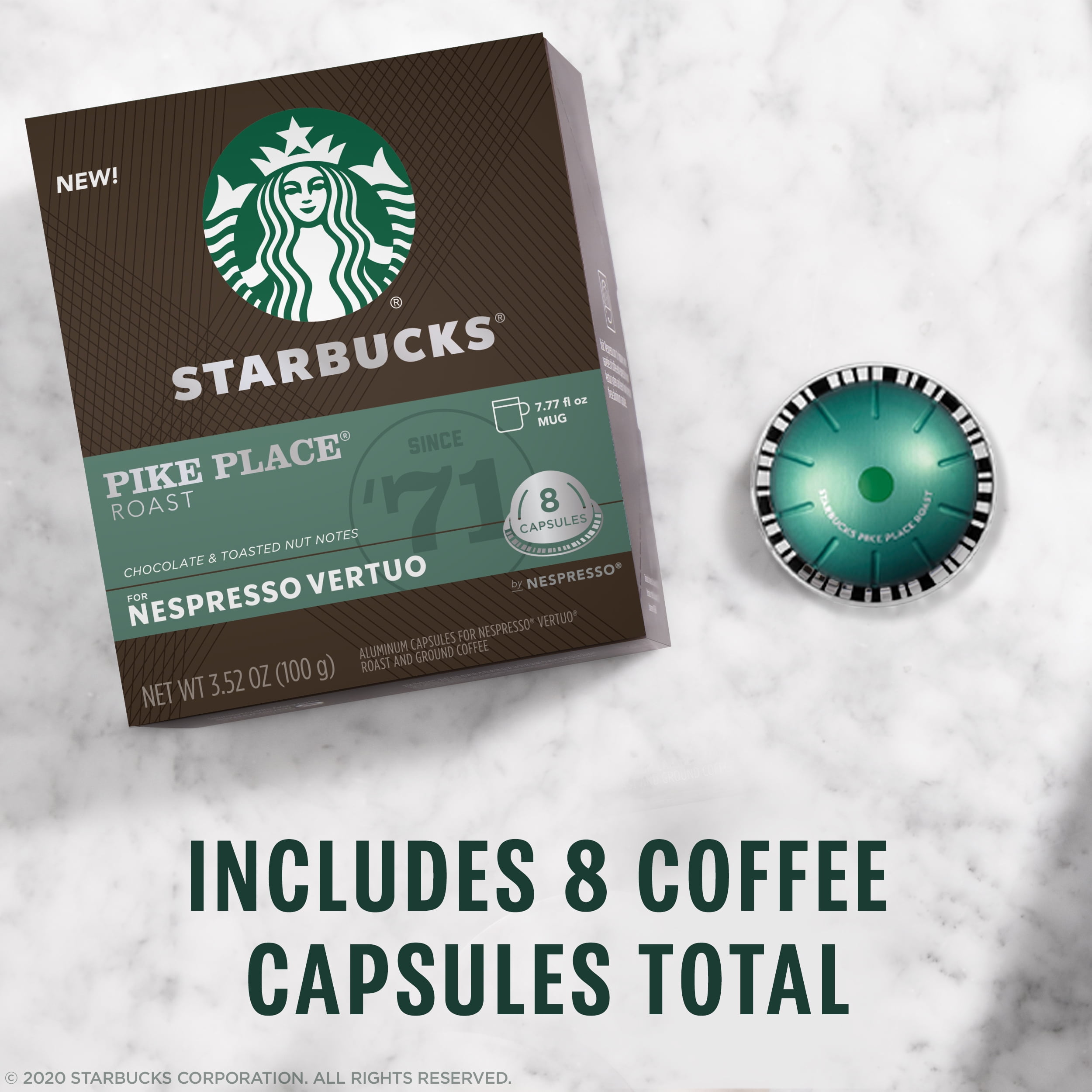 - INCLUDES: Enjoy the Starbucks coffee you love with a box of 8 capsules of Starbucks Pike Place Roast medium roast coffee for Nespresso Vertuo machines