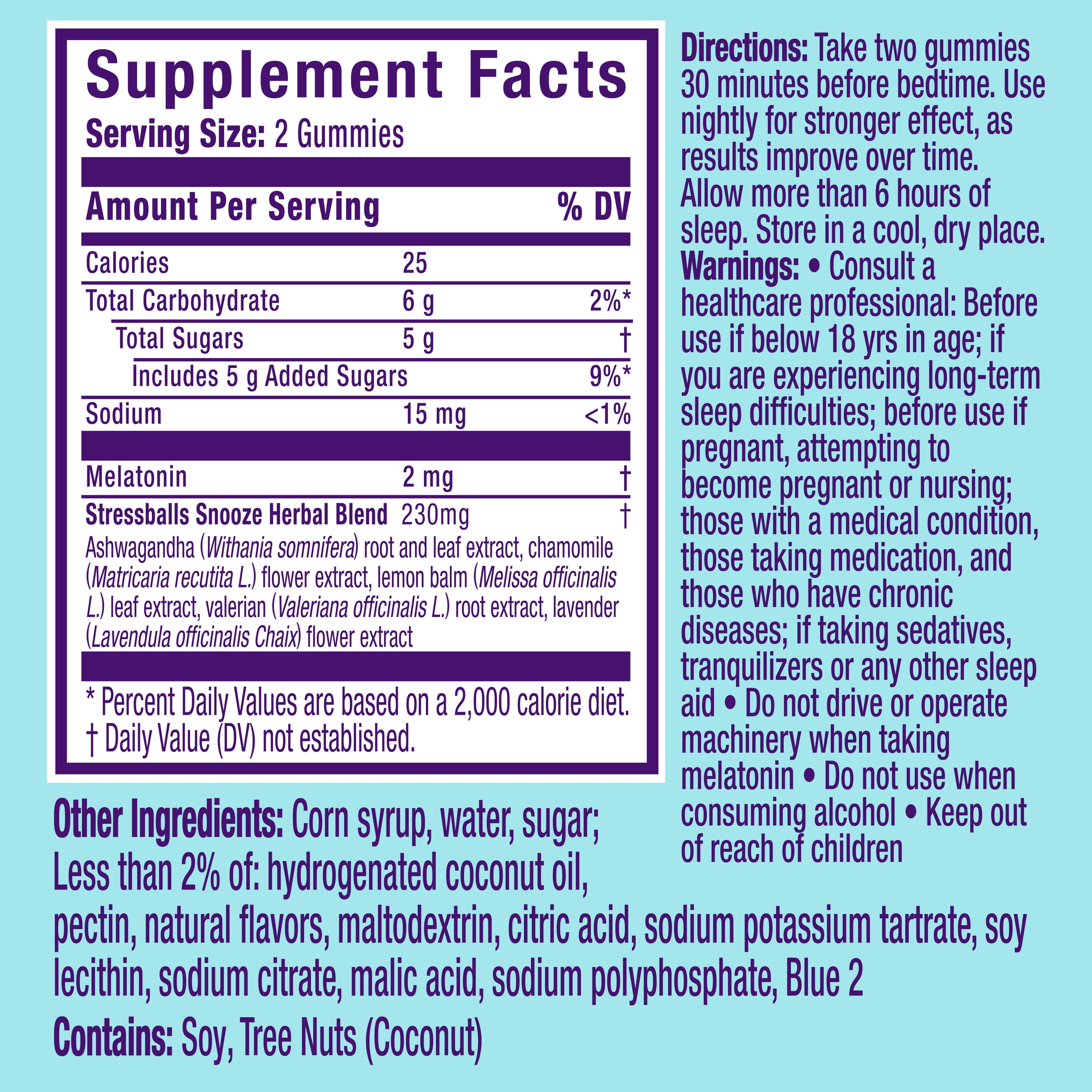 We all struggle with stress. It can make us feel overwhelmed and keep us up at night. And finding effective stress relief can be stressful, too. After a long day of tackling to-dos, you deserve some rest. With Stressballs De-Stress + Snooze, you can get a quality nights sleep without all the stress of the day keeping you awake. Its drug-free, habit-free herbal blend uses melatonin and the powerful ingredient Ashwagandha for everyday stress relief*. Ashwagandha is an adaptogen that has been used in Ayurvedic medicine for thousands of years to help manage stress. Not only does Ashwagandha provide stress relief, but it also helps you stay relaxed and calm*. Our ashwagandha is clinical-strength and contains 3 concentrated bioactives since its sourced from the roots and the leaves of the plant. Stressballs De-Stress + Snooze is naturally flavored, drug-free, gluten-free, lactose-free, gelatin-free, and non-habit forming. By taking Stressballs De-Stress + Snooze nightly within 30 minutes of your bedtime, youll be able to stress less, sleep more, and wake up ready to tackle your day without next-morning grogginess*.
